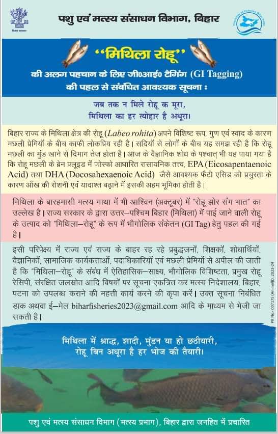 इसी परिपेक्ष्य में राज्य एवं राज्य के बाहर रह रहे प्रबुद्धजनों, शिक्षकों, शोधार्थियों, वैज्ञानिकों, सामाजिक कार्यकत्ताओं, पदाधिकारियों एवं मछली प्रेमियों से अपील की जाती है कि “मिथिला- रोहू” के संबंध में ऐतिहासिक साक्ष्य, भौगोलिक विशिष्टता, प्रमुख रोहू रेसिपी, संरक्षित जलस्रोत आदि विषयों पर सूचना एकत्रित कर मत्स्य निदेशालय, बिहार, पटना को उपलब्ध कराने की महत्ती कार्य करने की कृपा करें। उक्त सूचना निबंधित डाक अथवा ई-मेल biharfisheries2023@gmail.com आदि के माध्यम से भेजी जा सकती है।
