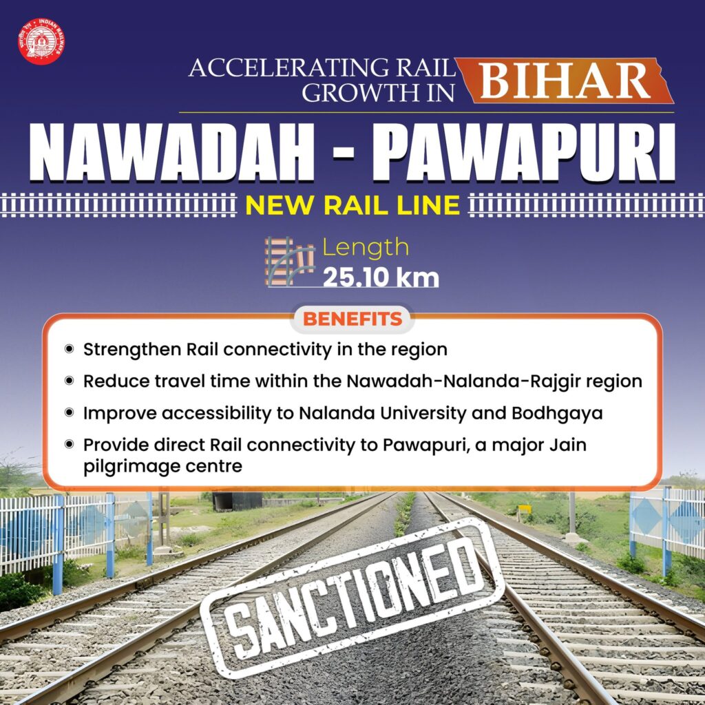 बिहार में रेल कनेक्टिविटी के विस्तार और क्षेत्रीय विकास को गति देने के लिए रेल मंत्री अश्विनी वैष्णव ने ऐतिहासिक निर्णय लेते हुए नवादा और पावापुरी को जोड़ने वाली नई रेल परियोजना को स्वीकृति प्रदान की। यह रेल लाइन 25.10 किलोमीटर लंबी होगी और इसके निर्माण पर लगभग ₹492.14 करोड़ की लागत आएगी। यह प्रस्ताव भारतीय रेल द्वारा नई रेल लाइनों के निर्माण हेतु निर्धारित अम्ब्रेला वर्क्स 2024-25 के अंतर्गत रखा गया था।