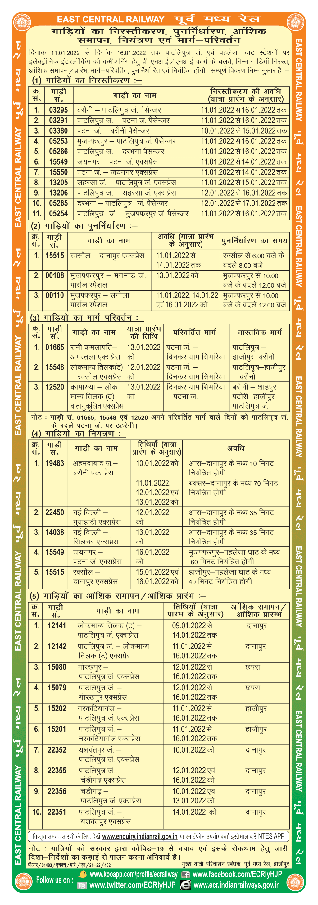 बिहार के पटना से दरभंगा, जयनगर, बरौनी,मुजफ्फपुर और सहरसा जाने वाले यात्रियों को इस सप्ताह परेशानी का सामना करना पड़ेगा। क्योंकि पूर्व मध्य रेलवे के पाटलिपुत्र और पहलेजा घाट स्टेशन पर इलेक्ट्रॉनिक इंटरलॉकिंग की कमीशनिंग हेतु दिनांक 11.01.2022 से 16.01.2022 तक प्री-एन.आई./एन.आई. कार्य किया जाना है, जिसके फलस्वरूप इस रेलखंड से गुजरने वाली ट्रेनों के परिचालन में अस्थाई बदलाव किया गया है । इसे लेकर East Central Railway रेलवे ने आदेश जारी कर दिया हैं।