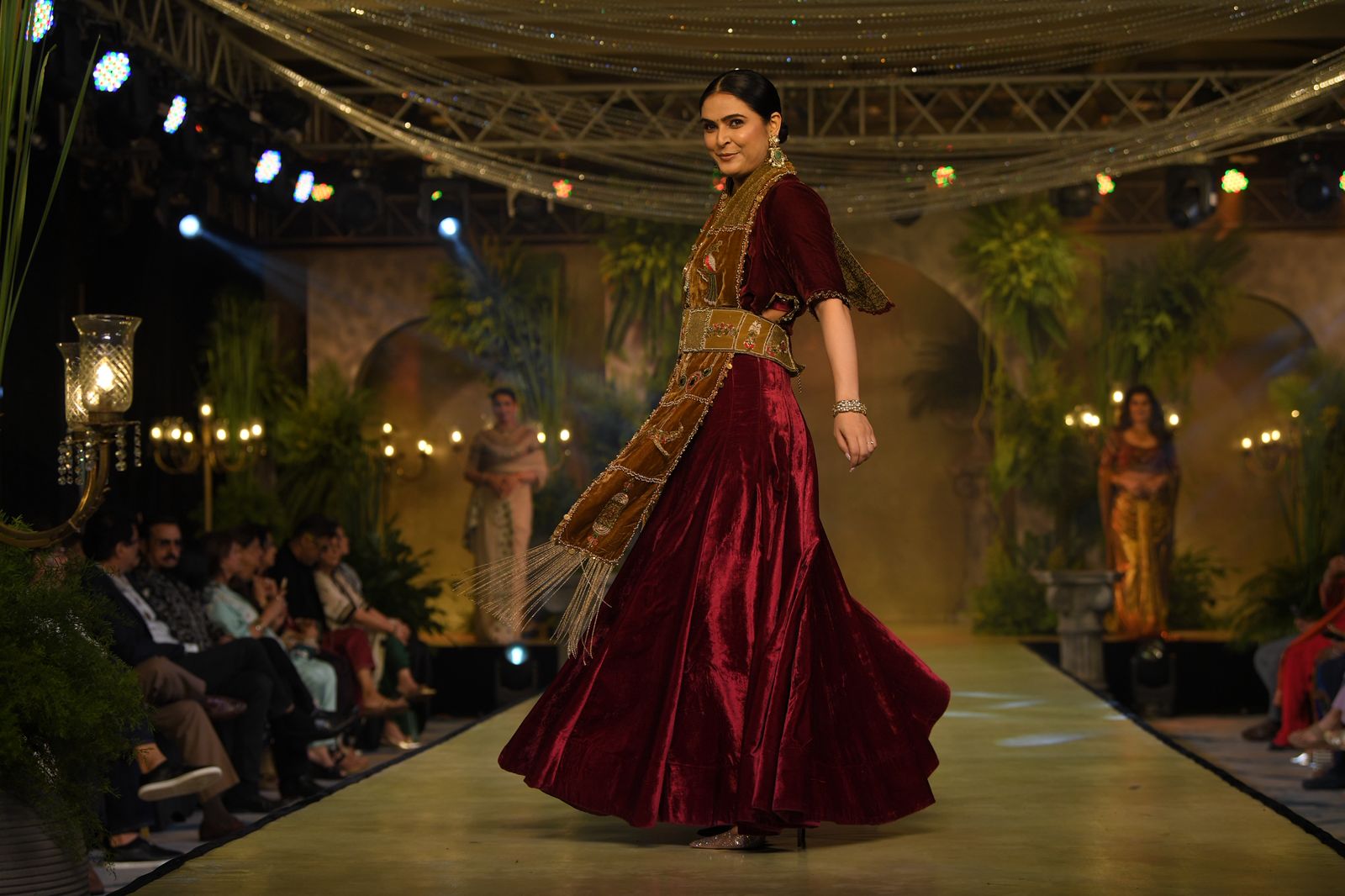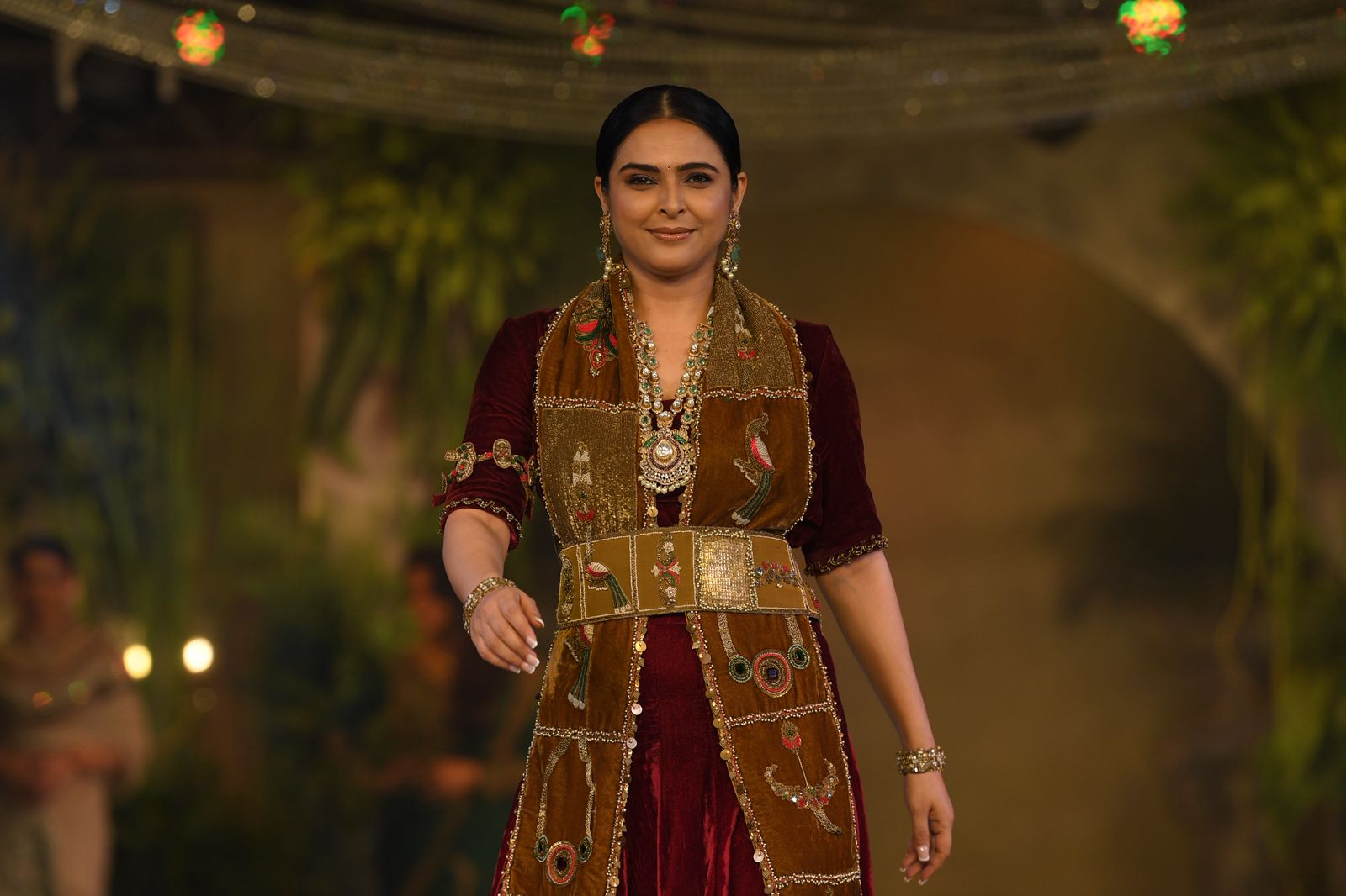 गहरे मैरून वेलवेट आउटफिट में सजी मधुरिमा का लुक शाही होने के साथ-साथ बेहद संतुलित और सांस्कृतिक जुड़ाव लिए हुए था। कढ़ाईदार स्टोल, स्ट्रक्चर्ड बेल्ट और सधी हुई ज्वेलरी ने उनके व्यक्तित्व को और निखारा। लेकिन उनके लुक से कहीं ज्यादा प्रभावशाली था उनका शांत आत्मविश्वास। रैंप पर उनकी सहज चाल और संयमित भावों ने हर किसी का ध्यान खींचा।