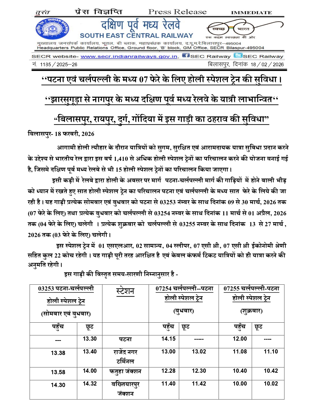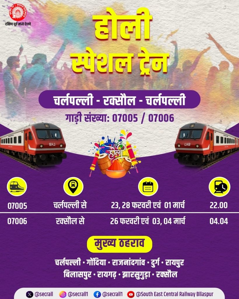 बिलासपुर। होली 2026 के दौरान यात्रियों की अतिरिक्त भीड़ को देखते हुए Indian Railways ने देशभर में 1,410 से अधिक होली स्पेशल ट्रेनों के संचालन की योजना बनाई है। इसी क्रम में South East Central Railway द्वारा पटना–चर्लपल्ली के मध्य होली स्पेशल ट्रेन चलाने की घोषणा की गई है।यह स्पेशल ट्रेन दक्षिण पूर्व मध्य रेलवे के झारसुगूड़ा से नागपुर सेक्शन के यात्रियों को भी सीधा लाभ पहुंचाएगी।