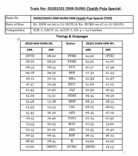 गाड़ी संख्या 03202 दानापुर –दुर्ग स्पेशल दानापुर से 6नवंबर की सुबह 8 बजे प्रस्थान कर दुसरे दिन 7 नवंबर को सुबह 10 बजे बजे पहुंचेगी। उसी प्रकार गाड़ी संख्या 13201 दुर्ग –दानापुर स्पेशल दुर्ग से दिन 1.15 मिनट में प्रस्थान कर 8नवबंर की दिन के 2.30 मिनट में दानापुर पहुंचेगी।