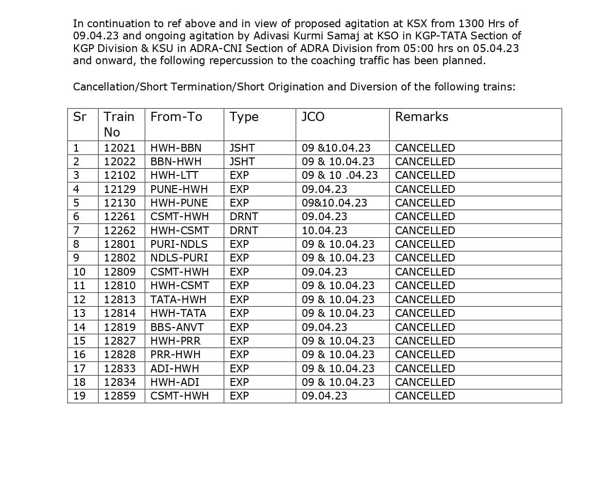 12.गाड़ी संख्या 12813 टाटा- हावड़ा स्टील एक्सप्रेस ((09और10अप्रैल को रद्द)