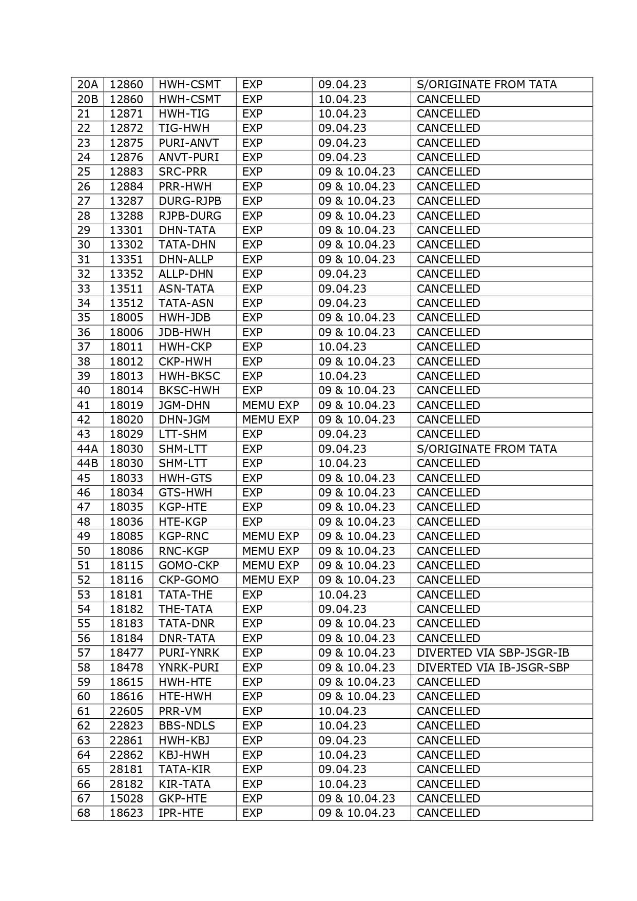 1.गाड़ी संख्या 12021 हावड़ा- बड़बिल जनशताब्दी एक्सप्रेस (09और10अप्रैल को रद्द)