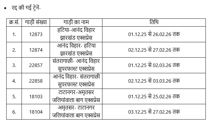 सर्दियों में उत्तर भारत में बढ़ने वाले घने कोहरे को देखते हुए भारतीय रेलवे ने बड़े पैमाने पर ट्रेन संचालन में बदलाव किए हैं। रेलवे ने 01 दिसंबर 2025 से 29 फरवरी 2026 तक कई ट्रेनों को पूरी तरह रद्द, आंशिक रूप से रद्द तथा कुछ ट्रेनों की आवृत्ति कम करने का निर्णय लिया है। इसका असर झारखंड, पश्चिम बंगाल, दिल्ली, पंजाब समेत कई राज्यों के यात्रियों पर पड़ेगा।