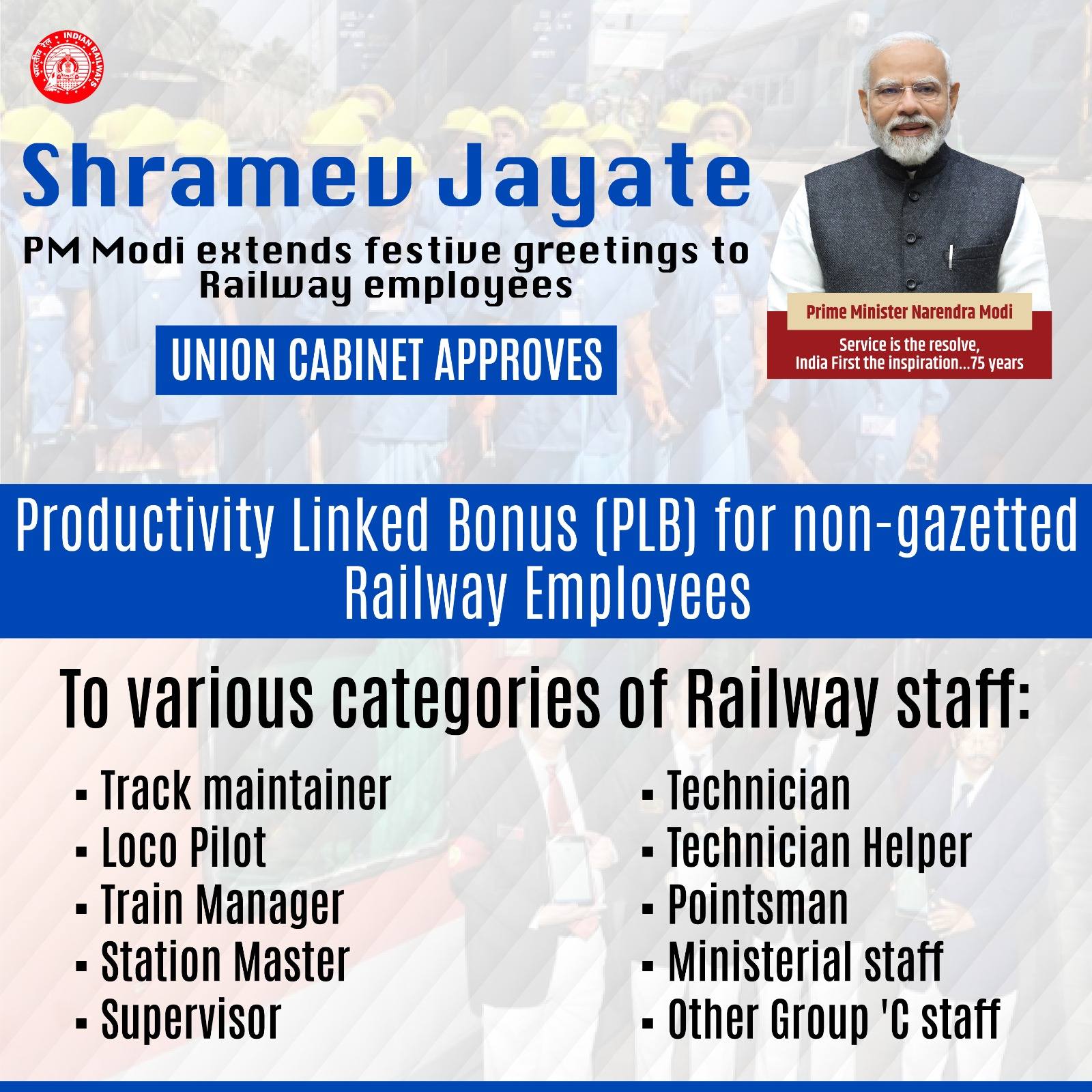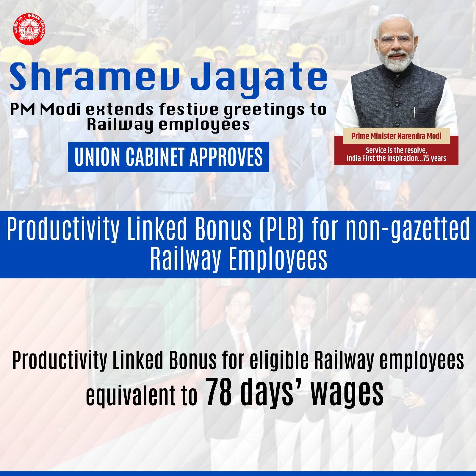 प्रधानमंत्री श्री नरेन्द्र मोदी की अध्यक्षता में केंद्रीय मंत्रिमंडल ने आज 10 लाख 91 हजार 146 रेलवे कर्मचारियों को 78 दिनों के उत्पादकता से जुड़े बोनस (पीएलबी) के रूप में 1865 करोड़ 68 लाख रुपये के भुगतान को स्वीकृति दी । रेलवे कर्मचारियों के बेहतर कामकाज को मान्यता देते हुए यह मंजूरी दी गई है ।