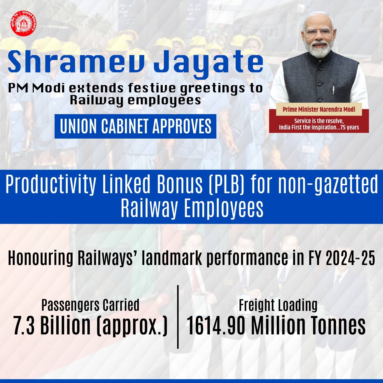 वर्ष 2024-25 में रेलवे का प्रदर्शन काफी अच्छा रहा । रेलवे ने रिकॉर्ड 1614.90 मिलियन टन माल ढुलाई की और लगभग 7.3 बिलियन यात्रियों को गंतव्य स्थल तक पहुंचाया