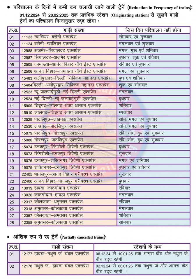 बिहार, झारखंड और बंगाल रेल यात्रियों को दिसबंर से परेशान का सामना करना पड़ेगा। क्योकि रेलवे ने दिसबंर से बढ़ते ठंडे के दौरान होने वाले कोहरे के देखते हुए सूरक्षा की दृष्टि से कई ट्रेनो रद्द कर दिया है।वही कई ट्रेनों के फेरों मे कमी और कई ट्रेनों के अपनी य़ात्रा की आंशिक समापन और शुरुआत करने को लेकर अधिसूचना जारी की है। इन ट्रेनों ने झारखंड के टाटानगर से प्रस्थान करने वाली ट्रेनों में टाटा—अमृतसर -टाटा जालियानावाला एक्सप्रेस, रांची से खूलने वाली हटिया- आनन्द विहार- हटिया एक्सप्रेस, बिहार से खुलने वाली कामख्या- गया एक्सप्रेस,बरौनी-अमंबला एक्सप्रेस सहित 24 यात्री ट्रेने शामिल हैं। .अधिसूचना के मुताबिक यह सभी ट्रेनें 1 दिसबंर से 28 फरवरी रद्द रहेगी।