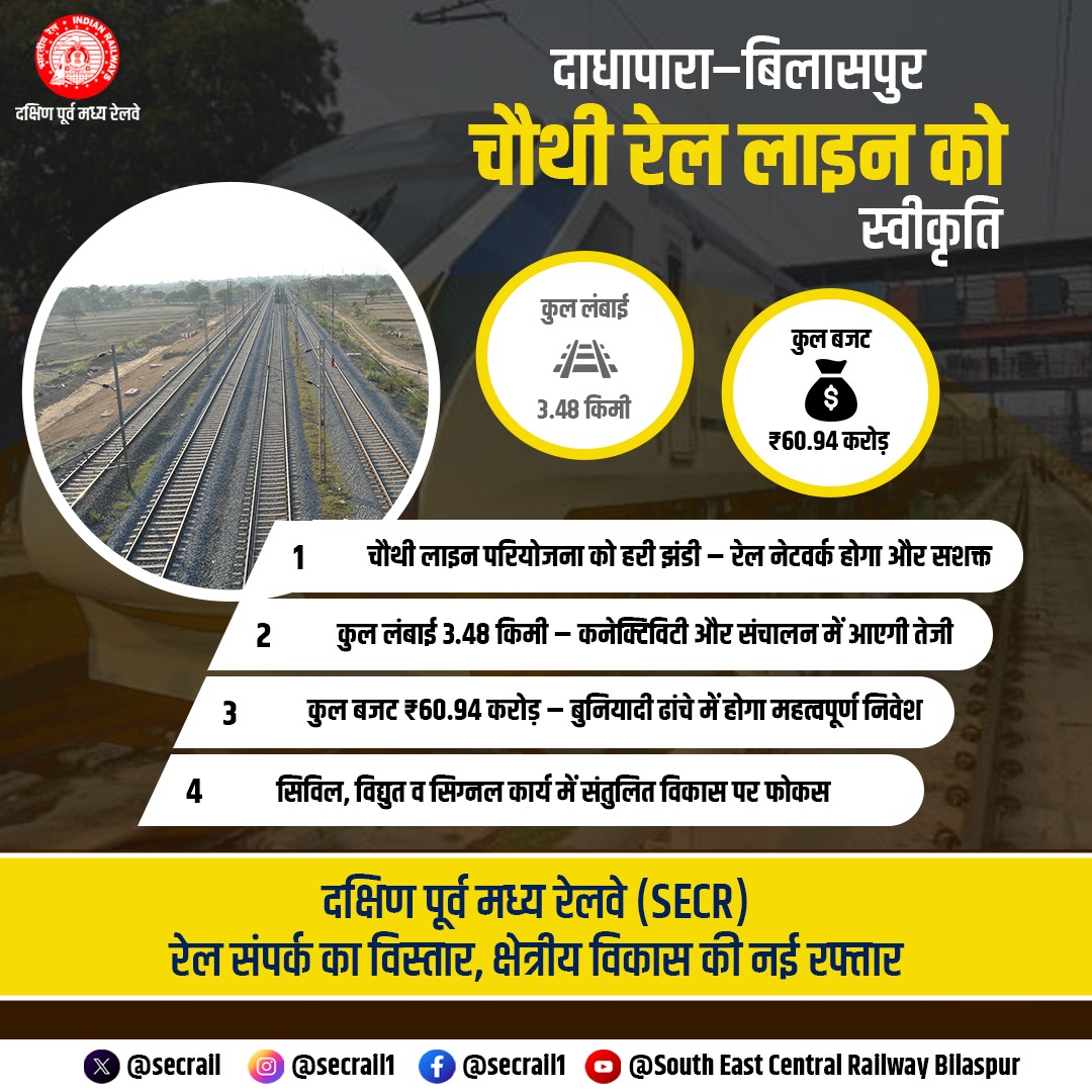 इसी क्रम को आगे बढ़ाते हुए मुंबई-हावड़ा ट्रंक रूट पर स्थित रायपुर और बिलासपुर के मध्य दो महत्वपूर्ण खंड दाधापारा-बिलासपुर (3.48 किमी) एवं दगोरी-निपानिया (6.86 किमी) में चौथी लाइन के निर्माण हेतु रेलवे बोर्ड द्वारा स्वीकृति प्रदान की गई है । इन परियोजनाओं के पूरा होने से क्षमता आवर्धन, परिचालन क्षमता में गुणात्मक वृद्धि तथा दक्षिण पूर्व मध्य रेलवे की रणनीतिक दक्षता को और भी मजबूती मिलेगी।