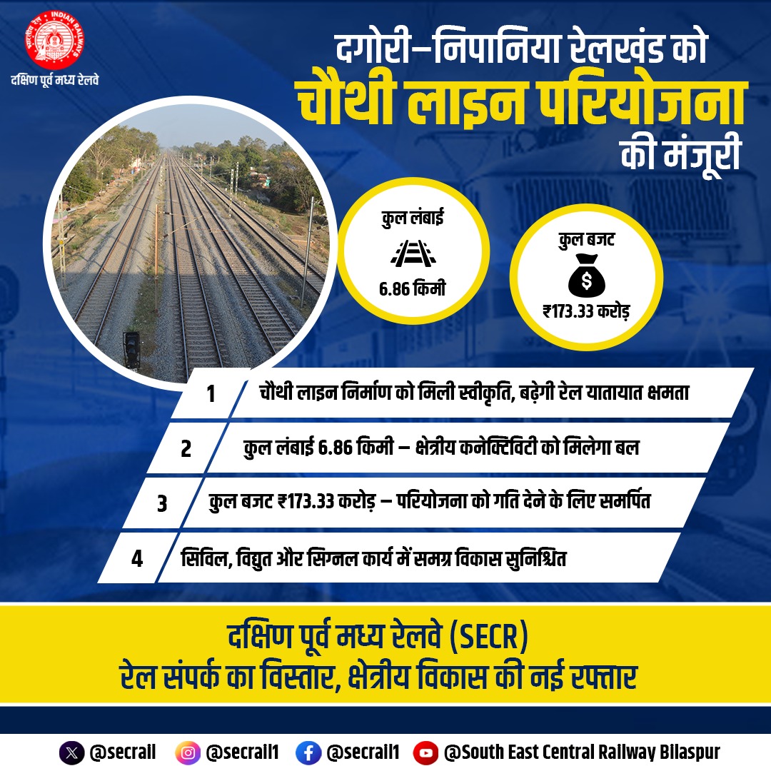 इसी क्रम को आगे बढ़ाते हुए मुंबई-हावड़ा ट्रंक रूट पर स्थित रायपुर और बिलासपुर के मध्य दो महत्वपूर्ण खंड दाधापारा-बिलासपुर (3.48 किमी) एवं दगोरी-निपानिया (6.86 किमी) में चौथी लाइन के निर्माण हेतु रेलवे बोर्ड द्वारा स्वीकृति प्रदान की गई है । इन परियोजनाओं के पूरा होने से क्षमता आवर्धन, परिचालन क्षमता में गुणात्मक वृद्धि तथा दक्षिण पूर्व मध्य रेलवे की रणनीतिक दक्षता को और भी मजबूती मिलेगी।