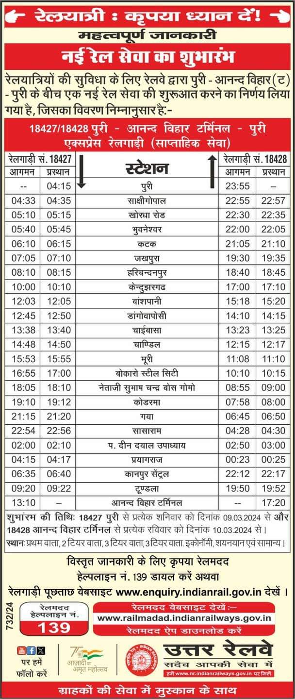 रेलखबर। झारखंड और बिहार के रेल यात्रियो को ओङिशा और उत्तर प्रदेश के साथ दिल्ली आने जाने के लिए एक और नई ट्रेन मिलने जा रही हैं। रेलवे एक नई ट्रेन पूरी से आनंद विहार चलाने जा रही है। यह ट्रेन साप्ताहिक होगा। यह ट्रेन पुरी से 9 मार्च से और 10 मार्च से आनंद विहार से शुरूआत होगी।इस ट्रेन के चालू होने से झारखंड के खासकर कोल्हान के रेल यात्रियो को पहली बार बिहार, उत्तर प्रदेश और नई दिल्ली के लिए सीधी ट्रेन मिल जाएगी। इस ट्रेन का ठहराव झारखंड मे चाइबासा, चांडिल, मुरी बोकारो और कोडरमा मे भी होगा।