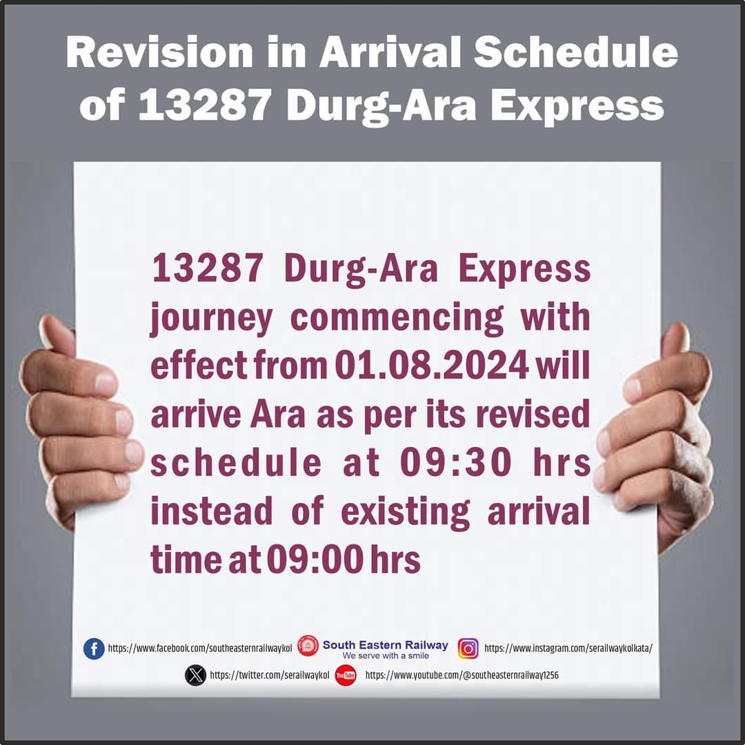 जमशेदपुर। दुर्ग से आरा आने वाली गाड़ी संख्या 13287 दुर्ग-आरा दक्षिण बिहार एक्सप्रेस का आरा में पहुंचने का समय बदल दिया गया है। अब यह ट्रेन सुबह 9.30 मिनट में आरा पहुंचेगी। जबकि पहले इस ट्रेन का आरा पहुंचने का समय सुबह 9 बजे था ।यह प्रभावी एक अगस्त से होगा ।इसको लेकर रेलवे ने अधिसूचना जारी कर दी है। वैसे दुर्ग से आरा के पहले तक के स्टेशन के समय में कोई परिवर्तन नही किया गया है।