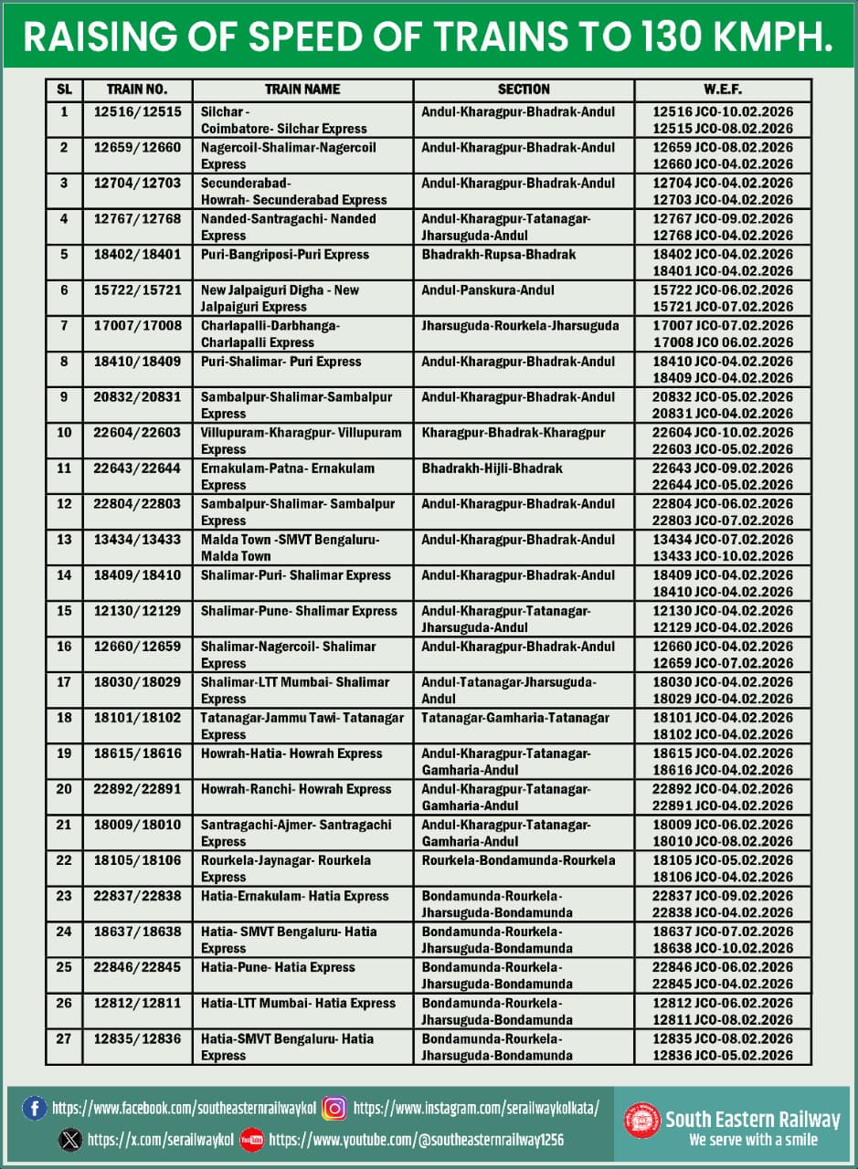 रेल यात्रियों को तेज, सुरक्षित और सुविधाजनक सफर का तोहफा देते हुए भारतीय रेलवे ने एक अहम फैसला लिया है। रेलवे प्रशासन ने दक्षिण पूर्व रेलवे और ईस्ट कोस्ट रेलवे जोन के अंतर्गत चलने वाली 54 ट्रेनों की अधिकतम गति 130 किलोमीटर प्रति घंटा तक बढ़ा दी है। यह नई व्यवस्था 4 फरवरी से 10 फरवरी 2026 के बीच चरणबद्ध तरीके से लागू की जा रही है।