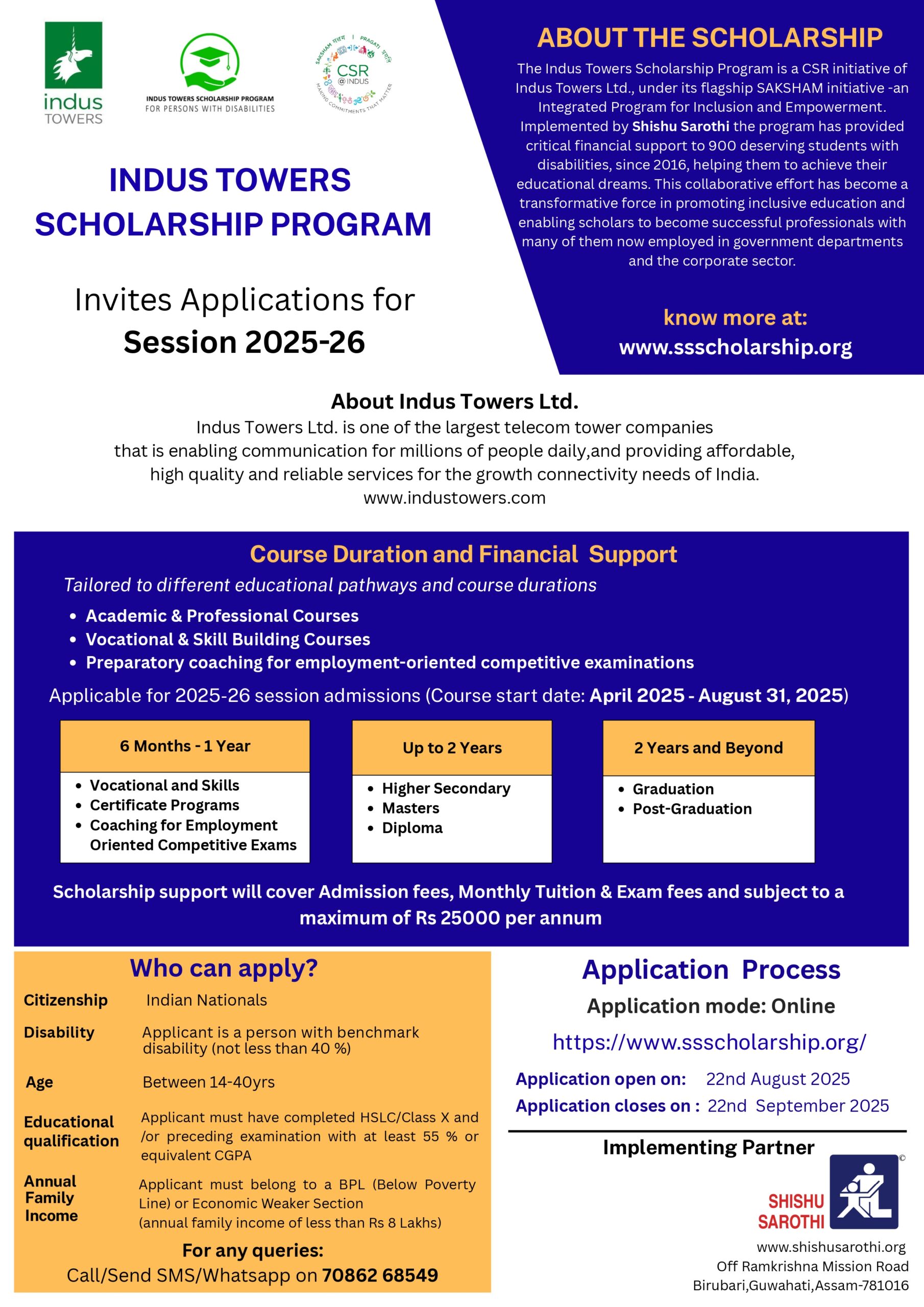 इंडस टावर्स लिमिटेड, जो दुनिया की सबसे बड़ी दूरसंचार अवसंरचना कंपनियों में से एक है, ने अपने प्रमुख सीएसआर कार्यक्रम ‘सक्षम’ के तहत शिशु सरोथी (सेंटर फॉर रिहैबिलिटेशन एंड ट्रेनिंग फॉर मल्टिपल डिसएबिलिटी) के सहयोग से इंडस टावर्स स्कॉलरशिप प्रोग्राम 2025-26 की शुरुआत की है। यह छात्रवृत्ति विशेष रूप से देशभर के दिव्यांग छात्रों को शिक्षा और आत्मनिर्भरता की दिशा में सशक्त बनाने के उद्देश्य से शुरू की गई है।