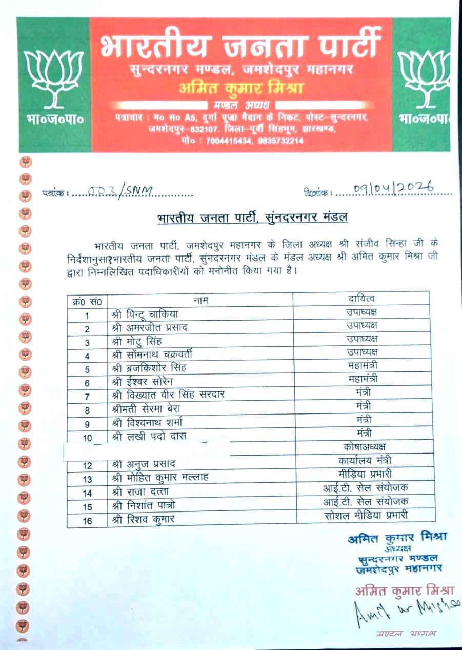 मिली जानकारी के अनुसार, भाजपा सुंदरनगर मंडल के अध्यक्ष अमित कुमार मिश्रा ने इस नई कमेटी का गठन किया है। जमशेदपुर महानगर अध्यक्ष संजीव सिन्हा के साथ विस्तृत चर्चा और उनकी औपचारिक स्वीकृति मिलने के पश्चात ही मंडल कमेटी की इस नई सूची को सार्वजनिक किया गया। यह कमेटी क्षेत्र में पार्टी की नीतियों को जन-जन तक पहुंचाने और स्थानीय स्तर पर संगठन को सक्रिय करने में महत्वपूर्ण भूमिका निभाएगी।