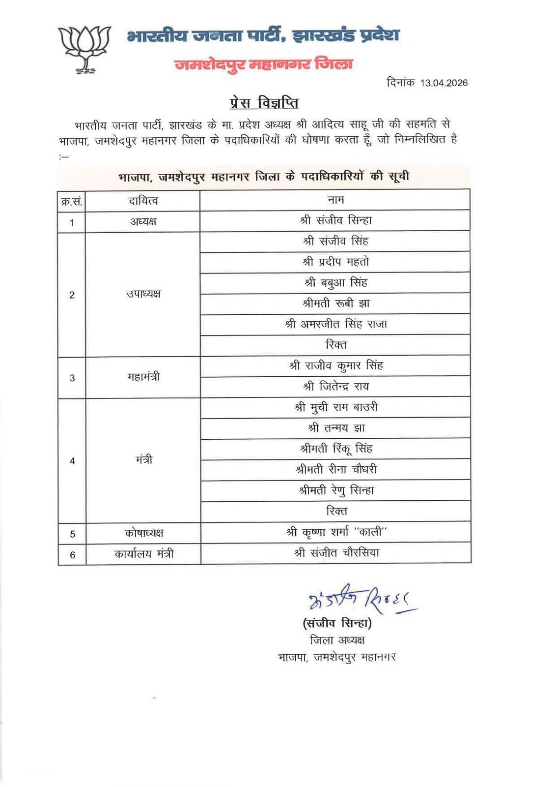 जमशेदपुर महानगर जिला संगठन को आगामी राजनीतिक चुनौतियों के लिए अधिक मजबूत और धारदार बनाने के उद्देश्य से इस नई कमेटी का गठन किया गया है। सोमवार, 13 अप्रैल 2026 को जिला अध्यक्ष संजीव सिन्हा ने एक प्रेस विज्ञप्ति जारी कर बताया कि प्रदेश अध्यक्ष आदित्य साहू की औपचारिक सहमति प्राप्त होने के बाद जिला पदाधिकारियों की सूची जारी कर दी गई है। इस नई टीम में क्षेत्रीय और सामाजिक संतुलन साधने का पूरा प्रयास किया गया है, ताकि पार्टी के अभियानों को समाज के हर वर्ग तक पहुंचाया जा सके।