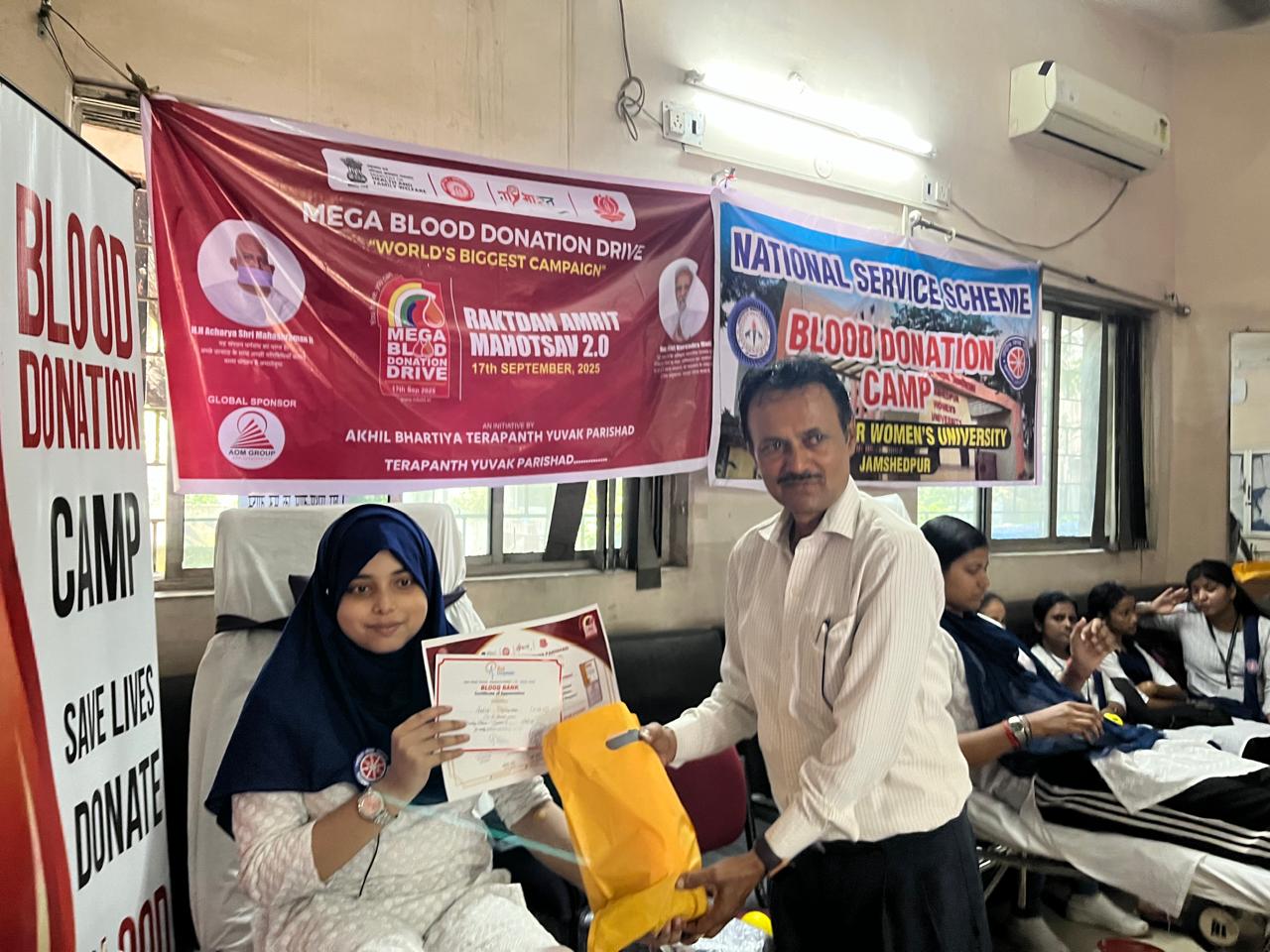 जमशेदपुर। समाज सेवा और मानवता की मिसाल पेश करते हुए जमशेदपुर महिला विश्वविद्यालय के बिष्टुपुर कैंपस में “रक्तदान अमृत महोत्सव 2.0” का सफल आयोजन किया गया। यह शिविर विश्वविद्यालय के एनएसएस विंग और एबीटीवाईपी (ABTYP) के संयुक्त तत्वावधान में आयोजित हुआ।