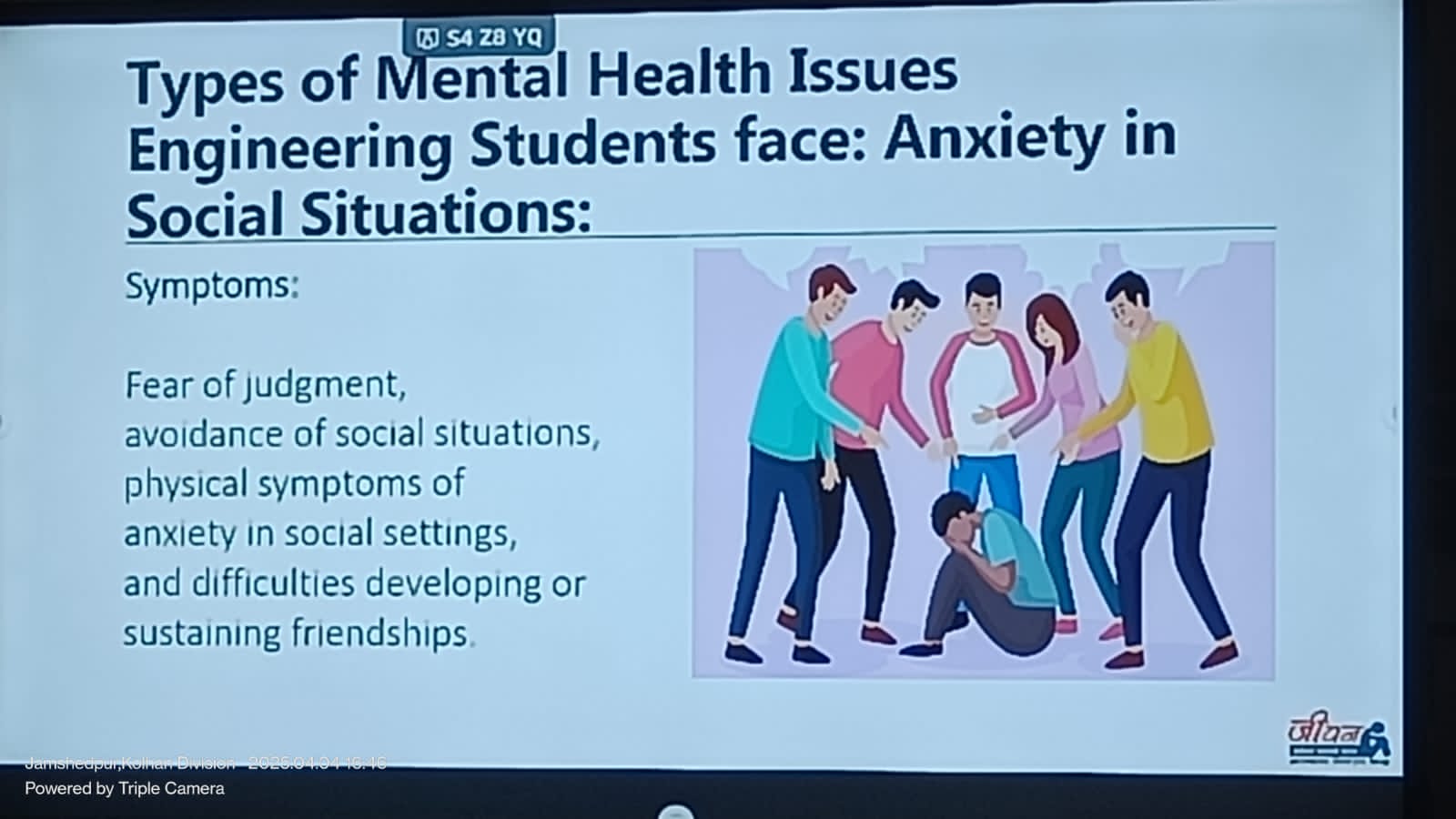 मानसिक स्वास्थ्य विशेषज्ञों श्री अचिंतों बनर्जी एंव राजीव रंजन ने तनाव और अवसाद के प्रारंभिक लक्षणों, जैसे :अनियमित नींद, सामाजिक अलगाव, रुचियों में कमी, निराशा की भावना, और आत्मग्लानि आदि के बारे में जानकारी दी। उन्होंने छात्रों को स्वयं की मानसिक स्थिति को पहचानने तथा जरूरत पड़ने पर निःसंकोच मदद लेने के लिए प्रेरित किया।