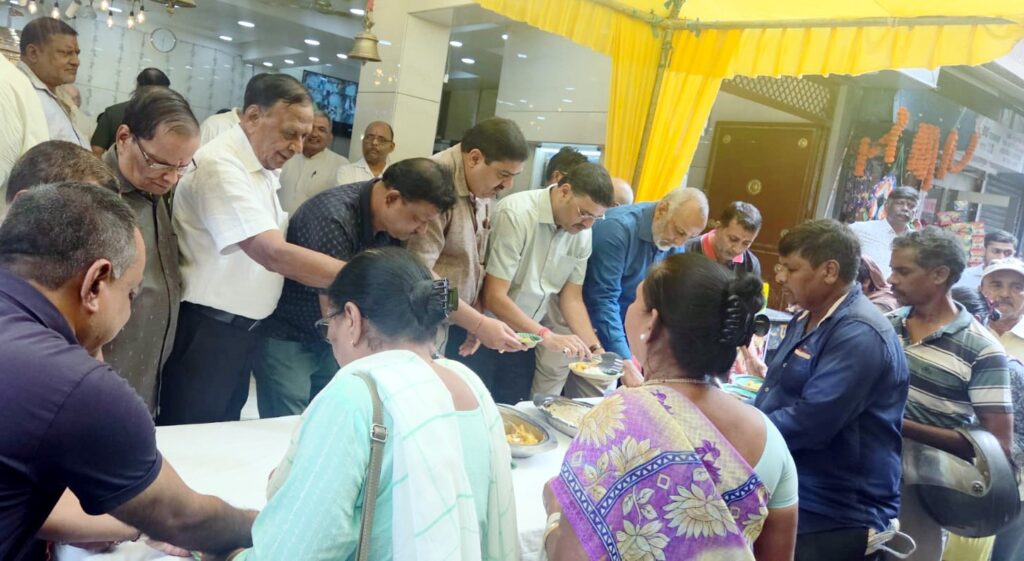 जमशेदपुर। साकची बाजार स्थित श्री श्री साकची शिव मंदिर में जन सेवा कार्य के तहत शुक्रवार को स्व. विनोद कुमार अग्रवाल की चतुर्थ पुण्यतिथि पर मंदिर में पूजा अर्चना कर प्रसाद (सुजी का हलवा, पुड़ी, पुलाव और आलु-चना की सब्जी) का वितरण किया गया। प्रसाद लगभग 4,000 (चार हजार) से अधिक लोगों ने ग्रहण किया। इसका आयोजन शिव मंदिर कमिटी के लालचंद अग्रवाल एंव बबलु अग्रवाल द्धारा अपने पिता (स्व. विनोद कुमार अग्रवाल) की याद में किया गया।