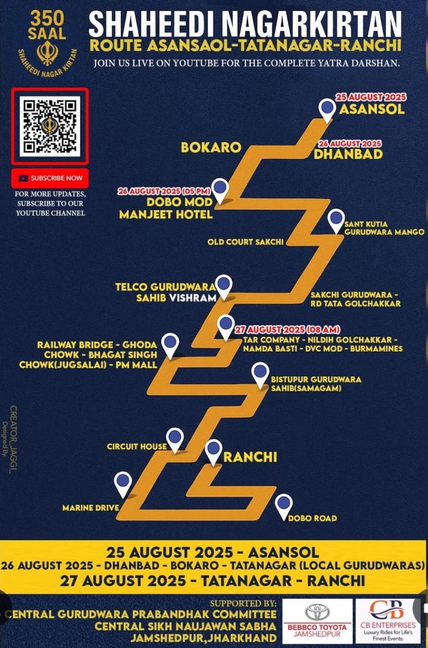 सेंट्रल गुरुद्वारा प्रबंधक कमिटी (CGPC) जमशेदपुर के प्रधान सरदार भगवान सिंह जी ने अपील की है कि शहर का हर धर्म, हर समाज और हर वर्ग आगामी शहीदी नगर कीर्तन यात्रा में शामिल होकर इसे ऐतिहासिक बनाए।