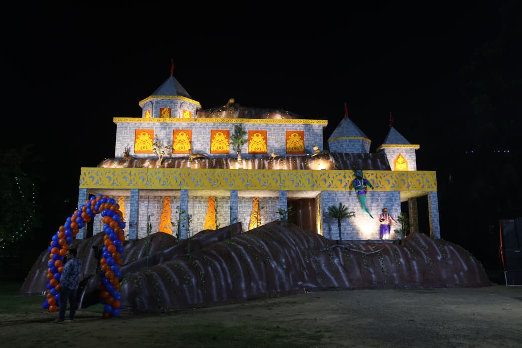 पूजा पंडाल को इस बार काल्पनिक गुफा की आकृति में तैयार किया गया है, जिसमें अलादीन का चिराग, कंकाल, भूत और भव्य विद्युत सज्जा विशेष आकर्षण का केंद्र बनी हुई है।