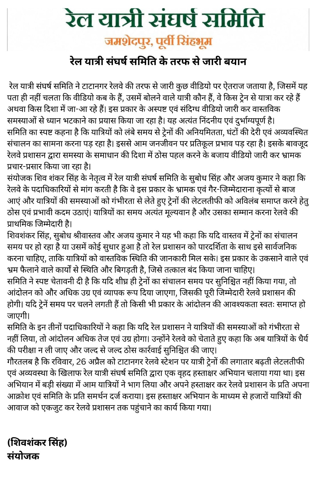 गौरतलब है कि बीते रविवार, 26 अप्रैल को टाटानगर स्टेशन पर समिति द्वारा एक विशाल हस्ताक्षर अभियान चलाया गया था। इसमें हजारों यात्रियों ने हस्ताक्षर कर रेलवे के खिलाफ अपना आक्रोश दर्ज कराया था। समिति ने साफ कर दिया है कि यात्रियों का समय मूल्यवान है और उसका सम्मान करना रेलवे की प्राथमिक जिम्मेदारी है।