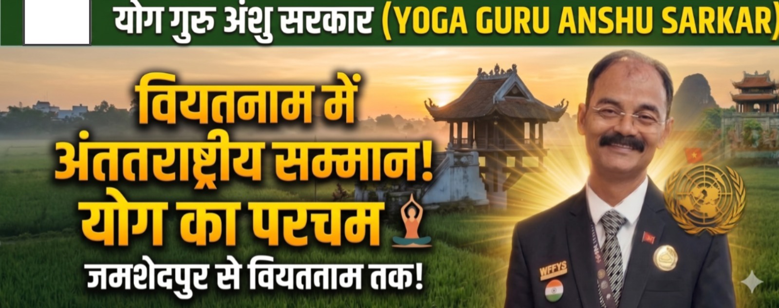 जमशेदपुर: लौहनगरी जमशेदपुर के लिए गर्व का क्षण है। शहर के सुप्रसिद्ध योग गुरु और सरकार योगा एकेडमी के संस्थापक अंशु सरकार को वियतनाम में आयोजित होने वाले एक भव्य अंतरराष्ट्रीय सम्मान समारोह में आमंत्रित किया गया है। वर्ल्ड फिटनेस फेडरेशन ऑफ योगासना स्पोर्ट्स इंडिया (भारत) के अध्यक्ष अंशु सरकार को यह सम्मान योग के क्षेत्र में उनके असाधारण योगदान और वैश्विक स्तर पर इसके प्रचार-प्रसार के लिए दिया जा रहा है।