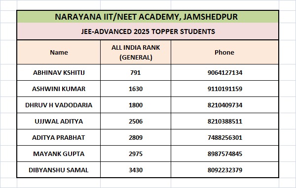 नारायणा जमशेदपुर से जे.ई.ई. (एडवान्स) 2025 में सफल छात्र-छात्राओं की सूची: