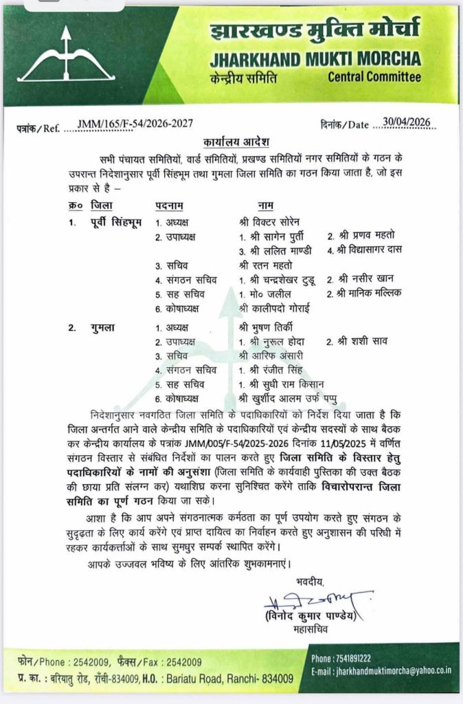 रांची / जमशेदपुर: झारखंड मुक्ति मोर्चा (झामुमो) की केंद्रीय समिति ने एक बड़ा संगठनात्मक फैसला लेते हुए पूर्वी सिंहभूम और गुमला जिले के लिए अपनी नई जिला समितियों की आधिकारिक घोषणा कर दी है। पंचायत, वार्ड, प्रखंड और नगर समितियों के सफल गठन के उपरांत संगठन को जमीनी स्तर पर और अधिक मजबूत करने के उद्देश्य से यह कदम उठाया गया है। 30 अप्रैल 2026 को झामुमो के महासचिव विनोद कुमार पांडेय द्वारा इस संबंध में औपचारिक कार्यालय आदेश जारी कर दिया गया है। नई कमिटी में अनुभवी नेताओं के साथ-साथ कई नए चेहरों को भी अहम जिम्मेदारियां सौंपी गई हैं।