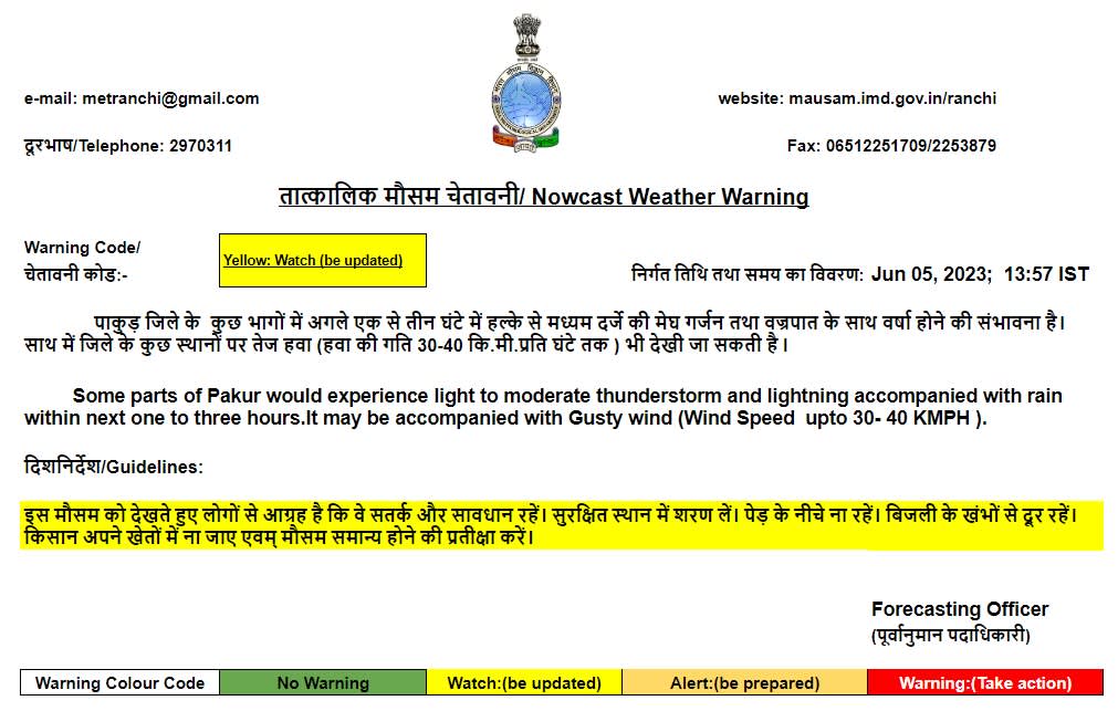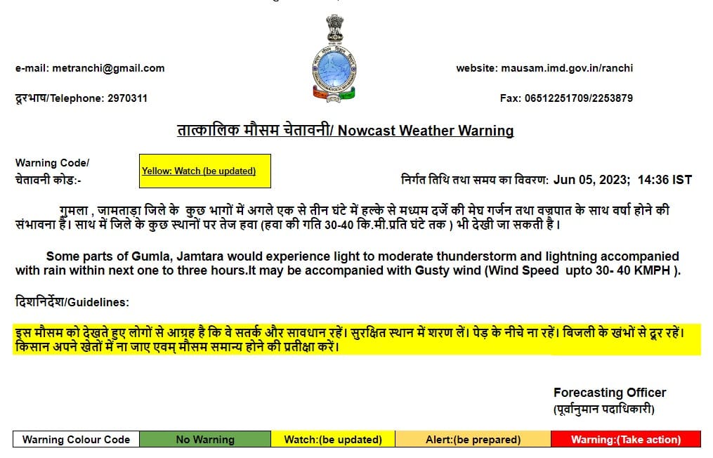 मौसम विज्ञान केन्द्र रांची ने चेतावनी जारी करते हुए कहा है कि सोमवार अगले दो से तीन घंटे में गुमला, जामताड़ा, दुमका, पाकुड़ , और देवघर जिले के कुछ भागों में मेघ गर्जन तथा व्रजपात के साथ वर्षा होने की संभावना है। इसके साथ इन जिलों के कुछ स्थानों पर तेज हवा (हवा-की गति 30-40 किलोमीटर प्रति घंटे के हिसाब से )बह सकती है।