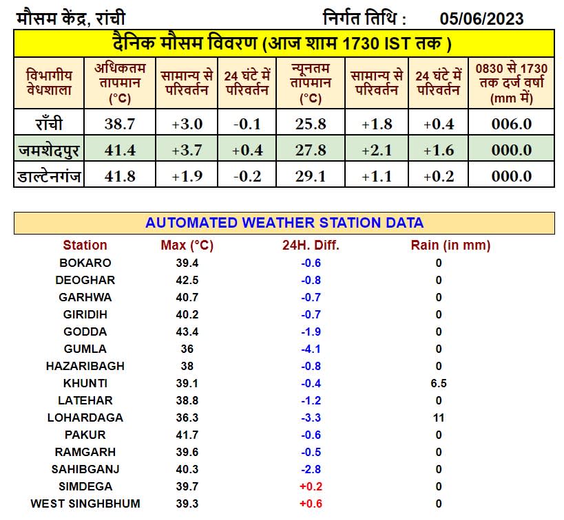 मौसम विज्ञान केंद्र रांची के अनुसार जमशेदपुर और इसके आसपास रहने वाले लोगों को फिलहाल गर्मी से राहत नहीं मिलने वाली है। रांची स्थित मौसम विज्ञान केन्द्र से मिली जानकारी के अनुसार सोमवार को जमशेदपुर का अधिकतम तापमान 41.4 सेल्सियस डिग्री नापा गया था। यह तापमान सामान्य से 3.7डिग्री अधिक था। वहीं न्यूनतम तापमान 27.8 डिग्री सेल्सियस डिग्री है जो सामान्य से 2.1 डिग्री सेल्सियस अधिक है। राज्य के अन्य जिलों की बात करें तो डाल्टेनगंज का तापमान 41.8 डिग्री अधिकतम नापा गया। यह तापमान सामान्य से 1.9 अधिक था। राज्य की राजधानी रांची का अधिकतम तापमान 38.7 सेल्सियस डिग्री रहा है । सबसे अधिक तापमान गोड्डा का रहा । यहां पर अधिकत्तम तापमान 43.4 रहा।