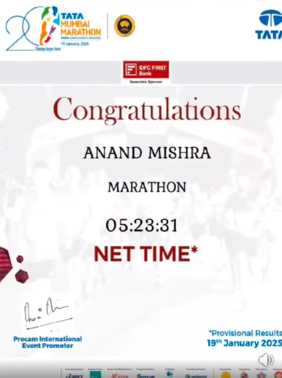 जमशेदपुर। मुंबई में 20वीं टाटा मैराथन मुंबई दौड़ के 42.197 किलोमीटर के फूल मुंबई मैराथन की दूरी साकची थाना प्रभारी साहब पुलिस निरीक्षक आनंद मिश्रा ने 5 घंटे 23 मिनट 31 सेकंड में पूरी की। फुल मैराथन दौड़कर शहर में वापस आने पर विभिन्न संस्थाओं द्वारा उन्हें सम्मानित किया गया है। वह पहले हॉफ मैराथन दौड़ मैं शामिल होते रहे हैं पहली बार वे फुल मैराथन का हिस्सा बने।