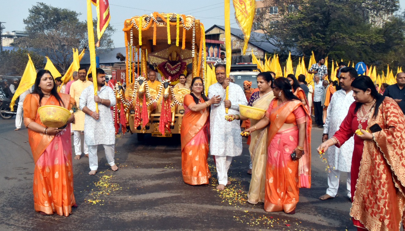 जमशेदपुर। श्री श्री साकची शिव मंदिर एवं श्री श्याम परिवार का 37वॉं श्री श्री श्याम महोत्सव गुरूवार को शिव मंदिर में धूमधाम से मनाया गया। महोत्सव को लेकर पूरे मंदिर परिसर समेत पुष्पो से सुज्जित श्याम बाबा का विशाल दरबार सजाया गया था। दोपहर 2 बजे से विराट शोभा (निशान) यात्रा मंदिर परिसर से निकली। जिसमें 1500 से अधिक भक्त श्याम नाम की ध्वजा (मोर पंख लगे निशान) लिए शामिल थे, जिसमें महिलाओं की संख्या अधिक थी। निशान यात्रा का शुभारंभ साकची शिव मंदिर में पूजा अर्चना के बाद बाबा के जयकारे से हुई, जो साकची पलंग मार्केट चौक, बड़ा गोलचक्कर चौक, स्टेट माइल रोड़ से काशीडीह होते हुए वापस मंदिर पहुॅच कर बाबा श्याम को निशान अर्पित किया गया। शोभा (निशान) यात्रा के दौरान भक्तों द्धारा लगाये जा रहे जय श्री श्याम, शीश के दानी, हारे का सहारा के जयघोष पूरे रास्ते गूंजता रहा। बाबा श्याम का सजा हुआ दरबार के आगे भक्तों द्धारा सफाई करते हुए फूल बिछाये जा रहे थे। शोभा यात्रा में सबसे आगे दो घोड़े पर सवार दो बच्चे और उसके पीछे दो ब़ड़े ध्वजा एक बाबा श्याम और दूसरा हनुमान जी का लिये भक्त चल रहे थे। नासिक से आये 75 लोगों द्वारा बजाये जा रहे ढोल देखते ही बन रही थी।