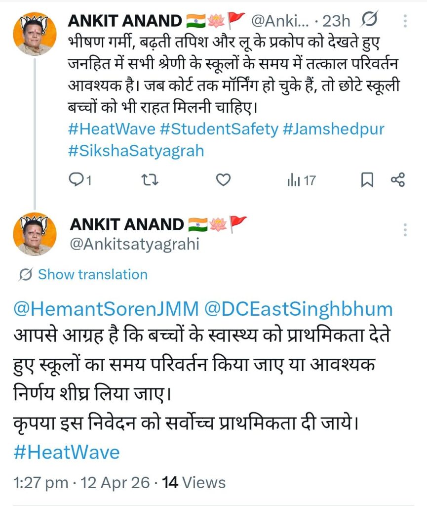 अंकित आनंद ने इस अहम मुद्दे पर सोशल मीडिया प्लेटफॉर्म ‘एक्स’ (पूर्व में ट्विटर) का सहारा लेते हुए सीधा राज्य के मुखिया तक अपनी बात पहुंचाई है। उन्होंने अपनी पोस्ट में मुख्यमंत्री हेमंत सोरेन और पूर्वी सिंहभूम जिले के उपायुक्त कर्ण सत्यार्थी को विशेष रूप से टैग किया है। उन्होंने दोनों शीर्ष अधिकारियों से इस गंभीर और संवेदनशील मामले में त्वरित हस्तक्षेप करने और जल्द से जल्द स्कूल टाइमिंग को मॉर्निंग (प्रातःकालीन) शिफ्ट में करने का आधिकारिक आदेश जारी करने का कड़ा आग्रह किया है।