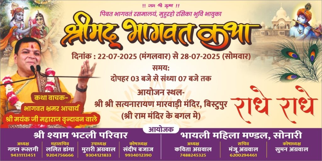 जमशेदपुर। शहर की सामाजिक एवं धार्मिक दो संस्था क्रमशः श्री श्याम भटली परिवार जमशेदपुर एवं भयली महिला मंडल सोनारी द्धारा संयुक्त रूप से सात दिवसीय श्रीमद भागवत कथा का आयोजन 22 से 28 जुलाई तक बिष्टुपुर स्थित श्री श्री सत्यनारायण मारवाड़ी मंदिर (श्री राम मंदिर के बगल में) में होने जा रहा हैं।