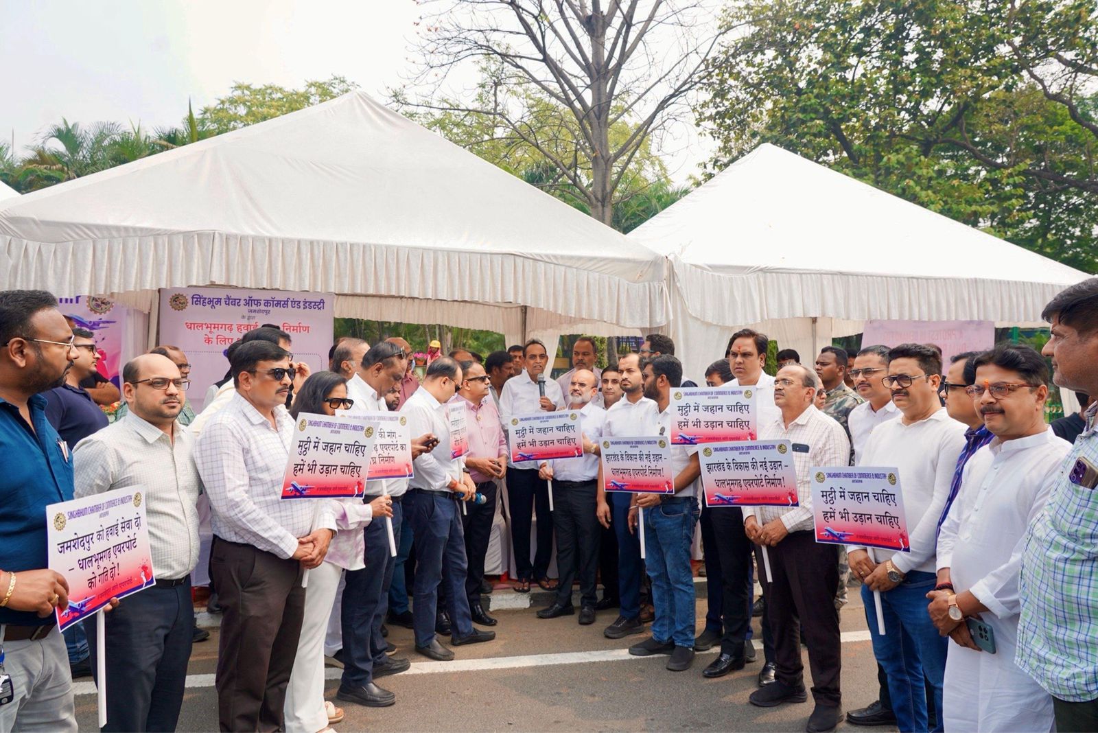 A peaceful protest was organized by the Singhbhum Chamber of Commerce and Industry (SCCI) near Postal Park, close to Gopal Maidan in Jamshedpur, demanding the early commencement of the Dhalbhumgarh Airport Project.