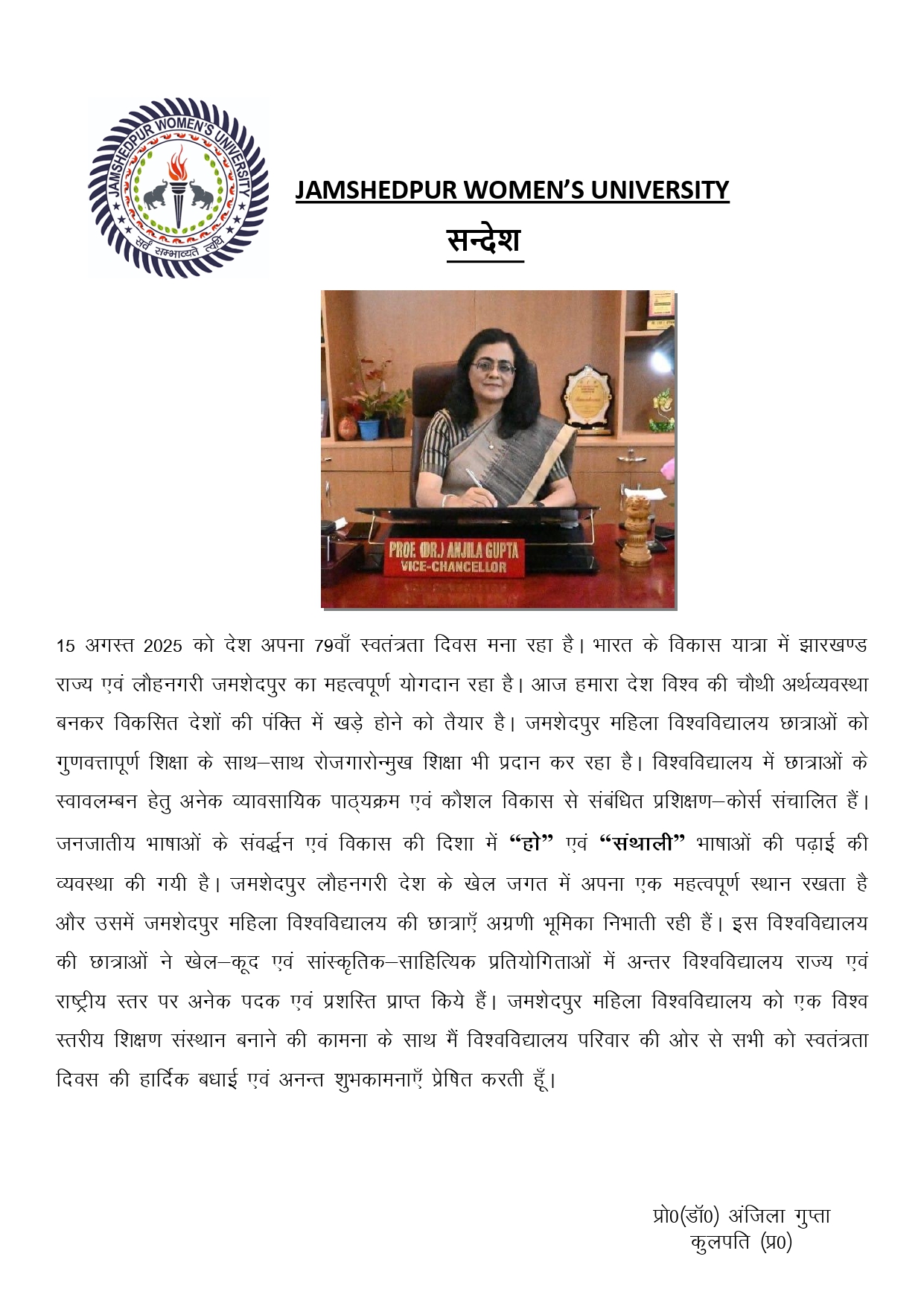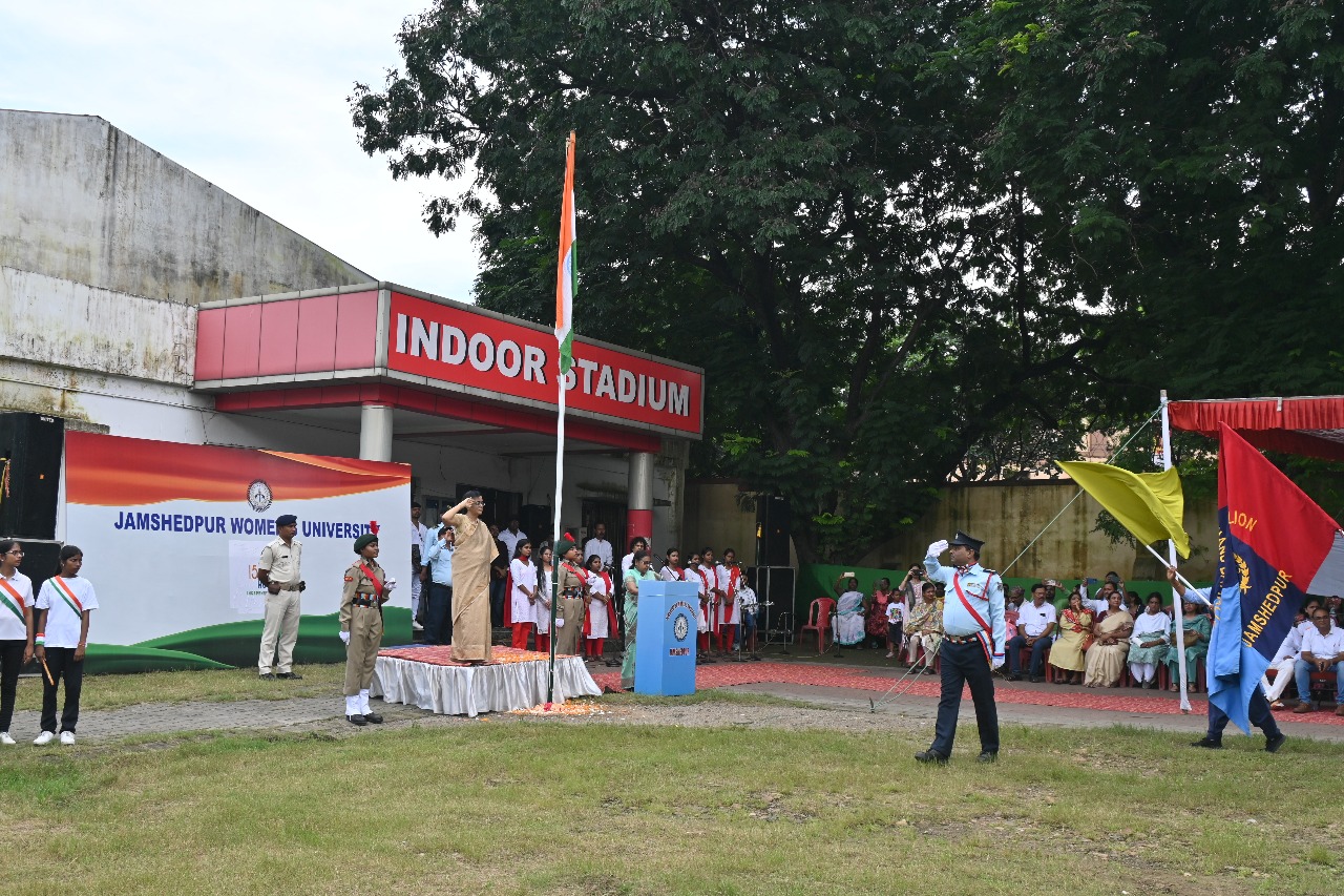 जमशेदपुर वीमेन्स यूनिवर्सिटी बिष्टुपुर प्रांगण और सिदगोड़ा कैम्पस में माननीय कुलपति प्रो० डॉ अंजिला गुप्ता के द्वारा झंडोत्तोलन किया गया । इस अवसर पर माननीय कुलपति महोदया ने स्वतंत्रता दिवस की शुभकामनाएँ देते हुए कहा कि देश को आजादी दिलाने में कई महापुरुषों का योगदान है। कई तरह के आन्दोलनों एवं लम्बे संघर्ष के बाद हमारा देश आजाद हुआ।1857 में सैनिकों ने विद्रोह किया था लेकिन इससे पहले जनजातीय विद्रोह झारखण्ड तथा भारत के कई प्रांतो में हो चुके हैं। विश्वविद्यालय की उपलब्धियों के संदर्भ में कहा कि हमारे सभी सत्र समय पर हो रहे है। परीक्षाएं समय पर हो रही हैं। किसी भी संस्था के लिए एक बेहतर टीम चाहिए जो कि इस विश्वविद्यालय में है। NEP के कोर्स भी यहाँ सुनियोजित ढंग से चल रहे हैं।