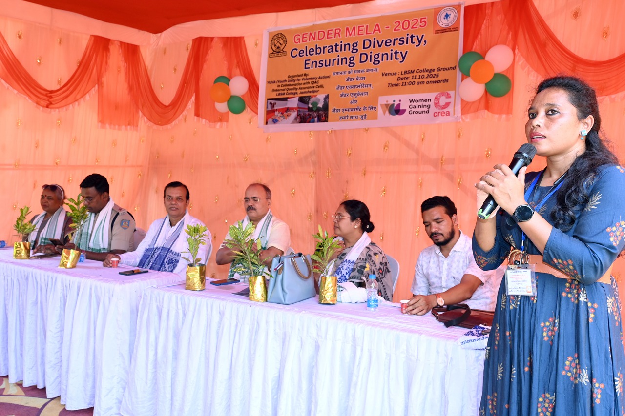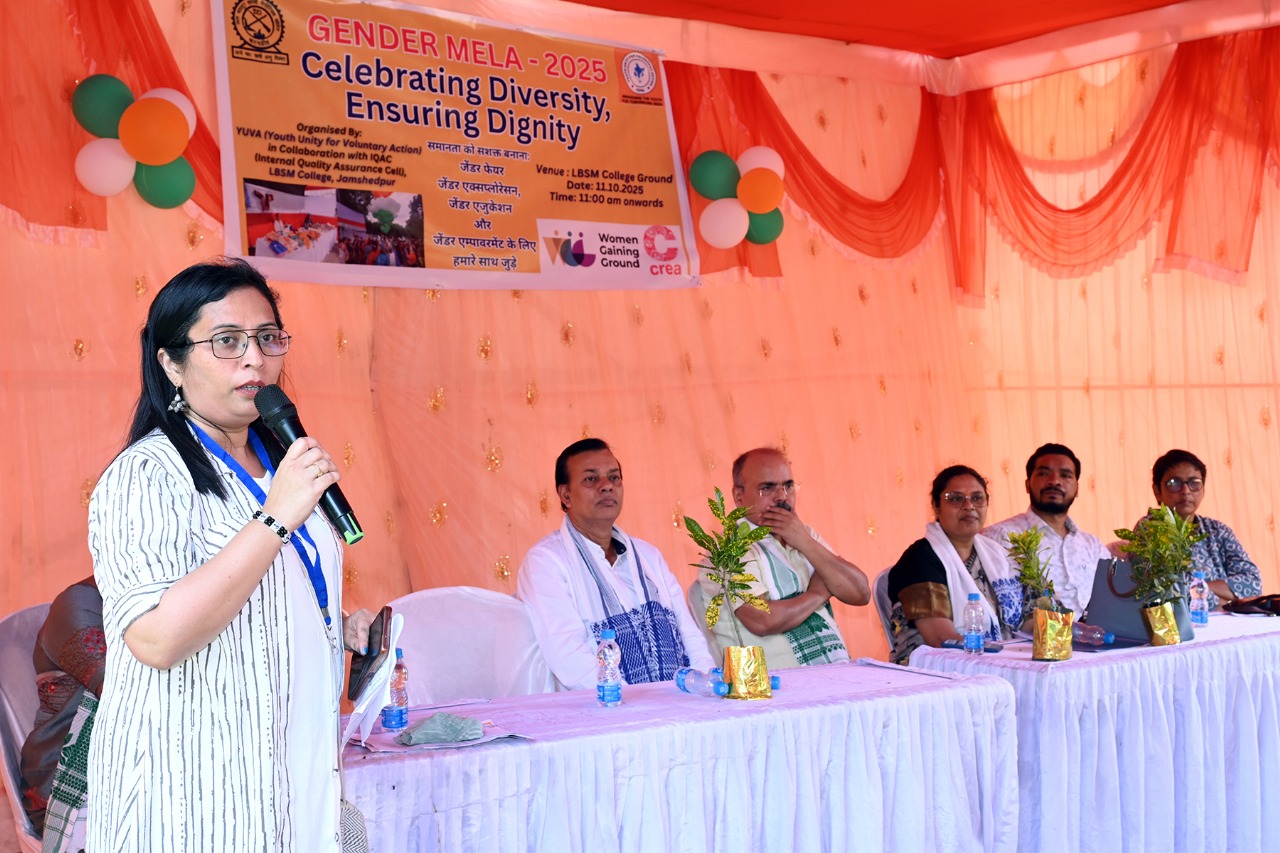 युवा संस्था एवं ‘क्रिया’, नई दिल्ली के संयुक्त तत्वाधान में संचालित कार्यक्रम ‘विमेन गैनिंग ग्राउंड’ के तहत उपरोक्त जेंडर मेला, इंटरनल क्वॉलिटी एश्योरेंस सेल और एलबी एसएम कॉलेज जमशेदपुर के संयुक्त तत्वाधान में आयोजित किया गया. कार्यक्रम का संचालन अंजना देवगम और अन्नी अमृता ने किया. वहीं, अंत में एलबीएसएम की प्राध्यापिका चंदन जायसवाल ने धन्यवाद ज्ञापन दिया.