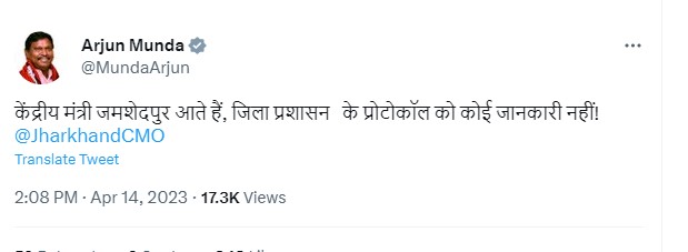 दरअसल केंद्रीय मंत्री अर्जुन मुंडा शुक्रवार को संप्रदायिक सौहार्द बिगाड़ने के आरोप में भेजे गए जेल भाजपा नेता अभय सिंह सहित अन्य ,भाजपा और विहिप कार्यकर्ताओ को मिलने घाघीडीह केन्द्रीय कारा गया थे। बकायदा इसकी जानकारी स्थानीय जिला प्रशासन को थी।लेकिन केन्द्रीय मंत्री वहा पहुंचने पर कोई भी प्रशासनिक अधिकारी मौजूद नही था। इस दौरान वे जेल के अंदर भी गए। सभी से मिलकर वापस भी लौट कर वापस भी आ गए। लेकिन जिला प्रशासन की ओर से कोई पदाधिकारीगण नही पहुंचा।माना जा रहा है कि इसी से नाराज होकर उन्होंने tweet की हैं।