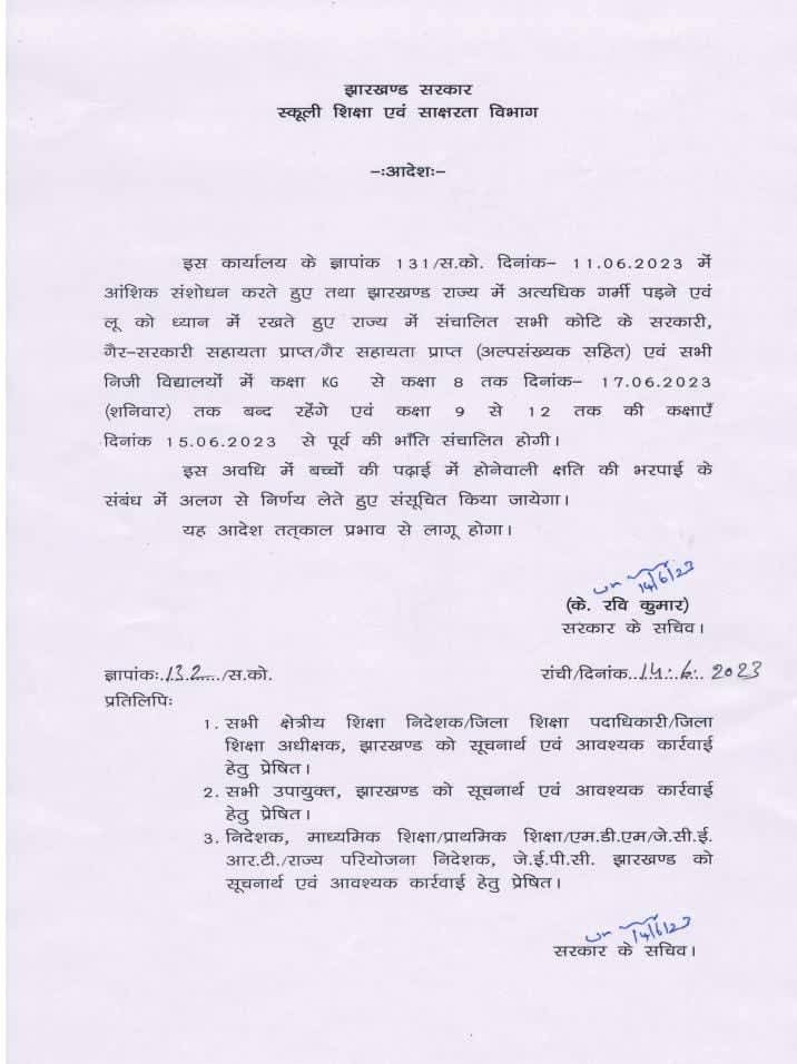 इसको लेकर राज्य सरकार के स्कूली शिक्षा और साक्षरता विभाग ने आदेश जारी किया है.विभाग के द्वारा जारी आदेश में लिखा है कि राज्य में अत्याधिक गर्मी पड़ने एवं लू को ध्यान में रखते हुए राज्य के सभी कोटि के सरकारी, गैर सरकारी, सहायता प्राप्त,गैर सहायता प्राप्त (अल्पसंख्यक सहित) एवं निजी विद्यालयों में कक्षा केजी से 8वीं तक दिनांक 17-6-2023(शनिवार)तक बंद रहेंगे एवं कक्षा 9से 12तक की कक्षाएं दिनांक 15-6-2023 से पूर्व की भांति संचालित होगी.