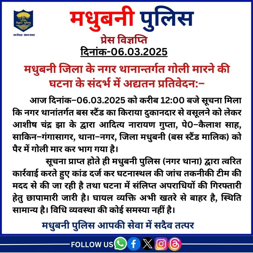 एक्सरे रिपोर्ट आने के बाद ही पता चल सकेगा की गोली फंसी है अथवा निकल गई। मधुबनी का कालीमंदिर स्थित निजी बस स्टैंड अब गैंगवार का अड्डा बनता जा रहा है। जब से काली मंदिर गंगासागर पर निजी बस स्टैंड आया है, तब से अवैध तरीके से इसका संचालन हो रहा है। इसका संचालन पूर्व वार्ड पार्षद इंद्र पूजा समिति के कैलाश शाह करते आ रहे थे। कई बार इस बस स्टैंड और काली मंदिर का बाजार विवादों में रहा है। यह बस स्टैंड और काली मंदिर पर रोड किनारे अवैध तरीके से लगाई जाने वाली दुकान लाखों रुपए के अवैध उगाही का एक जरिया बन गया है।