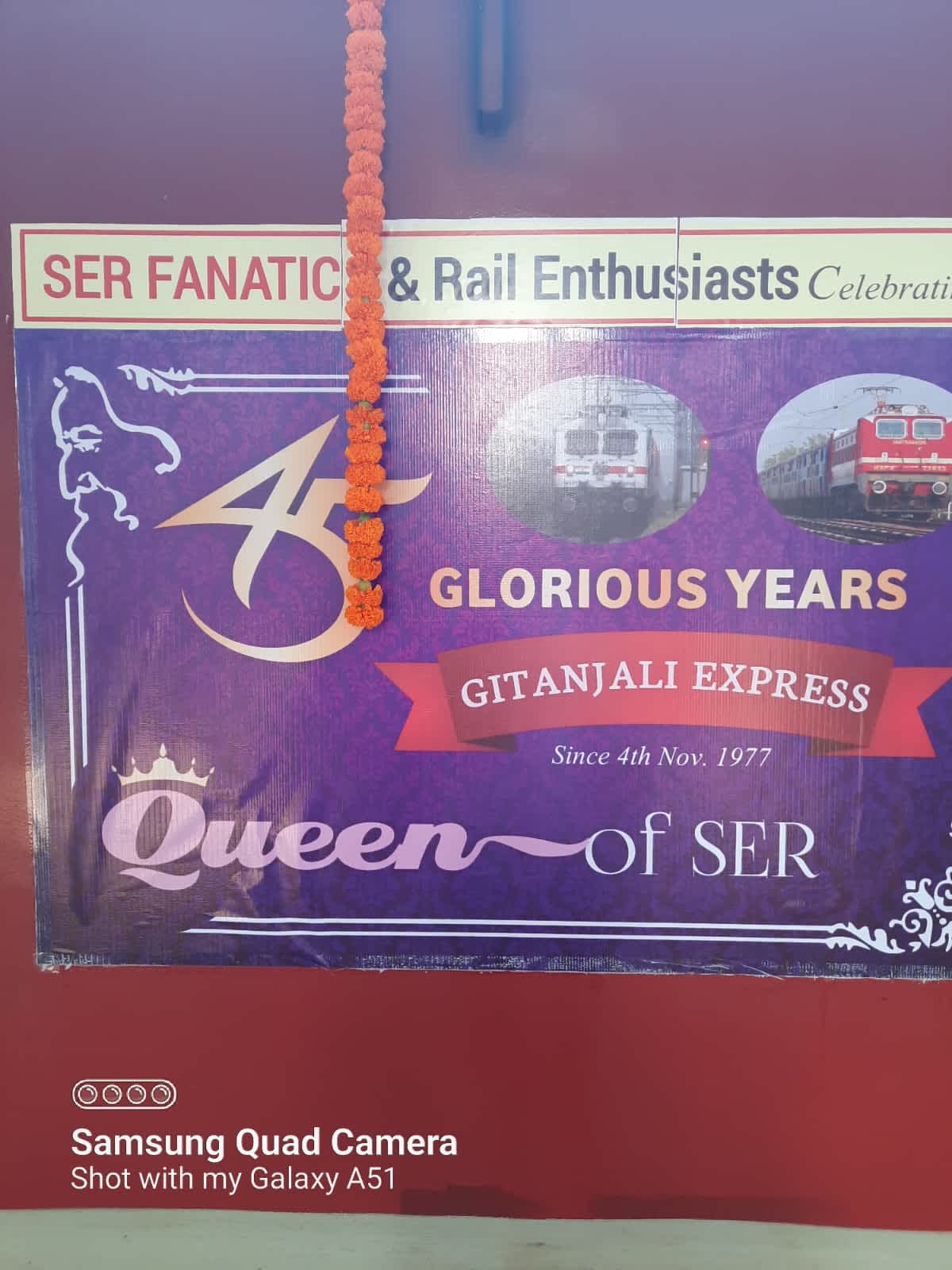 हावड़ा – मुबई रेल मार्ग पर चलने वाली (गाड़ी संख्या 12859/12860) गीताजंलि एक्सप्रेस आज अपने सफर की 45 साल पुरे कर लिए ।दो महानगरों को जोड़ने वाली यह ट्रेन टाटा –राउलकेला- रायपुर- नागपुर – भुसावल जंक्शन के रास्ते आना जाना करती है। आज भी इस ट्रेन का जलवा पहले की तरह बकरार है। वैसे आज भी हावड़ा से और कई सुपरफास्ट ट्रेन चल रही है। लेकिन गीताजंलि एक्सप्रेस में टिकट के लिए आज भी मारा मारी हैं।वही 45 साल पुरे होने पर हावड़ा स्टेशन में एक सादा समारोह में रेलवे अधिकारियों और कुछ यात्रियों की उपस्थिति में लोको के सामने केक कटिंग की । वही इसको लेकर खड़गपुर Sr Dcm ने अपने सोशल साईट पर लिख कर प्रशंसको को बधाई दी है।