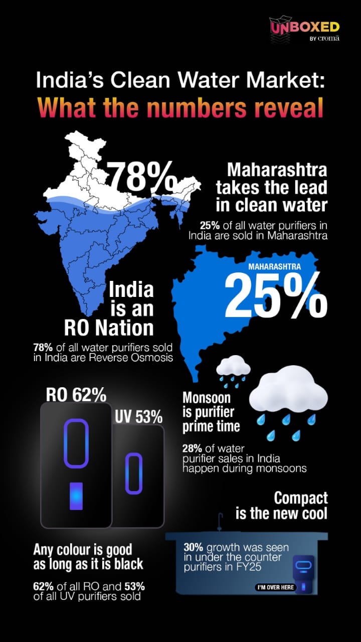 इलेक्ट्रॉनिक्स रिटेल कंपनी क्रोमा की ताज़ा रिपोर्ट बताती है कि वित्त वर्ष 2026 तक इस क्षेत्र में लगभग 22 प्रतिशत अतिरिक्त वृद्धि हो सकती है। कंपनी के शोध के अनुसार, भारत में सालभर होने वाली कुल वाटर प्यूरीफायर खरीद का लगभग 35 प्रतिशत हिस्सा सिर्फ मानसून के दौरान ही पूरा होता है।
