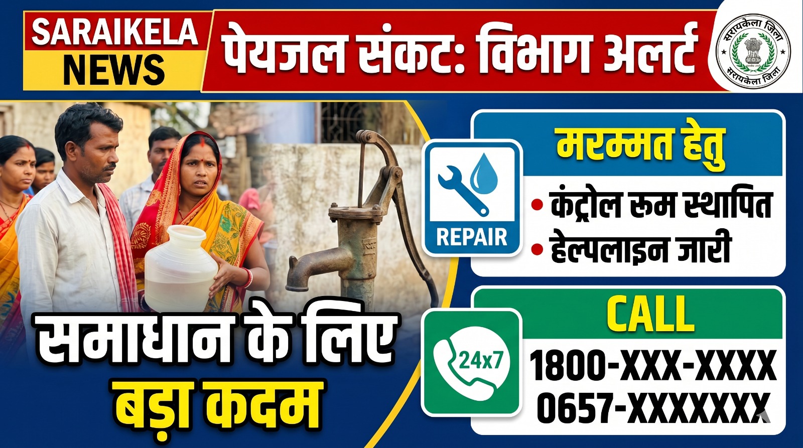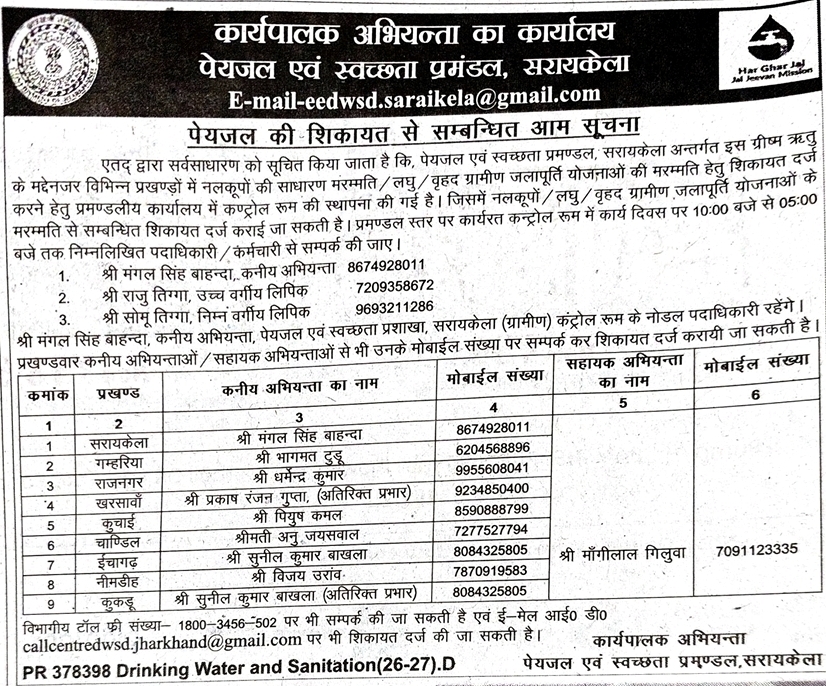 सरायकेला: गर्मी के मौसम में ग्रामीण क्षेत्रों में पेयजल की निर्बाध आपूर्ति सुनिश्चित करने के लिए पेयजल एवं स्वच्छता प्रमंडल, सरायकेला ने एक आम सूचना जारी की है। विभाग ने नलकूपों (चापाकालों) और ग्रामीण जलापूर्ति योजनाओं की तत्काल मरम्मत के लिए जिला और प्रखंड स्तर पर अधिकारियों की सूची और उनके मोबाइल नंबर सार्वजनिक किए हैं।