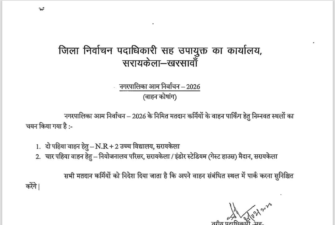 सरायकेला–खरसावाँ। नगरपालिका आम निर्वाचन–2026 के सफल और सुव्यवस्थित संचालन को लेकर जिला प्रशासन ने मतदान कर्मियों के वाहनों की पार्किंग और यातायात नियंत्रण से संबंधित महत्वपूर्ण दिशा-निर्देश जारी किए हैं। यह निर्णय Seraikela में चुनाव प्रक्रिया को सुरक्षित और निर्बाध रूप से संपन्न कराने के उद्देश्य से लिया गया है।