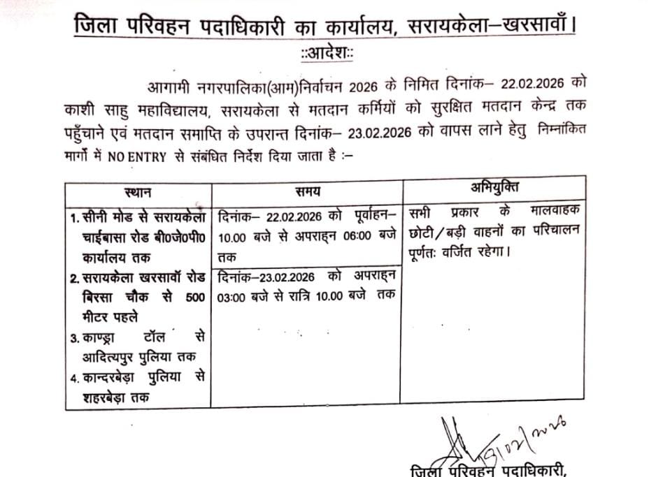 जिला परिवहन पदाधिकारी, सरायकेला–खरसावाँ द्वारा जारी आदेश के अनुसार 22 फरवरी 2026 को मतदान कर्मियों को काशी साहू महाविद्यालय, सरायकेला से सुरक्षित मतदान केंद्रों तक भेजने की प्रक्रिया के दौरान कुछ मार्गों पर यातायात नियंत्रण लागू रहेगा।