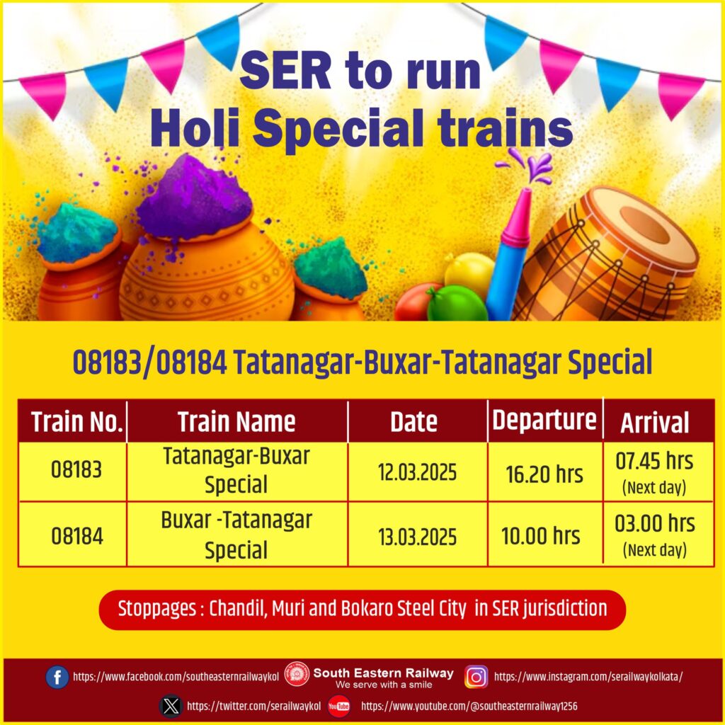 बक्सर से ट्रेन संख्या 08184 बक्सर –टाटा होली स्पेशल 13 मार्च को सुबह 10 बजे प्रस्थान करेगी। उसके बाद आरा 11.00 आगमन,11.02 प्रस्थान, दानापूर 11.35 आगमन 11.37 प्रस्थान,पटना 1.00आगमन 1.10 प्रस्थान , पटना साहिब 1.36 आगमन ,1.38 प्रस्थान, मोकामो 2.30आगमन ,2.32 प्रस्थान, क्यूल 4.20 आगमन 4.22 प्रस्थान, झाझा 05.05आगमन,05.10 प्रस्थान, जसीडीह 5.48 आगमन 5.50प्रस्थान, मधूपूर 6.15 आगमन ,6.17 प्रस्थान, चित्तरंजन 7.08 आगमन 7.10 प्रस्थान,धनबाद 9.10आगमन 9.15 प्रस्थान,चन्द्रपुरा 10.58 आगमन 11.00प्रस्थान, बोकारो स्टील सिटी 11.35 आगमन 11.37 प्रस्थान, मूरी 12.50आगमन 12.52 प्रस्थान,चांडिल रात के दो बजे आगमन और 2.02 बजे प्रस्थान करेगी। उसके बाद सुबह तीन बजे टाटानगर पहुंचेगी।
