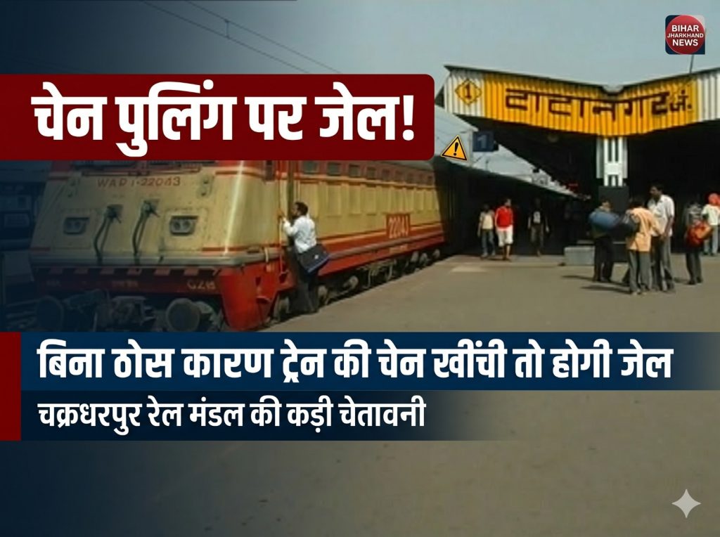 जमशेदपुर: दक्षिण पूर्व रेलवे के चक्रधरपुर रेल मंडल ने ट्रेनों में बिना उचित कारण अलार्म चेन पुलिंग (ACP) करने वाले यात्रियों के खिलाफ सख्त रुख अख्तियार कर लिया है। रेलवे द्वारा जारी प्रेस विज्ञप्ति के अनुसार, अनावश्यक रूप से चेन खींचना न केवल साथी यात्रियों के लिए असुविधा का कारण बनता है, बल्कि इससे ट्रेनों के परिचालन में भी भारी व्यवधान उत्पन्न होता है ।