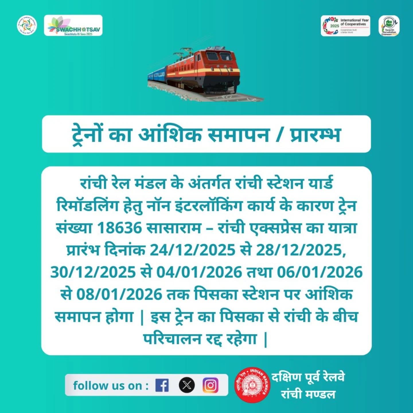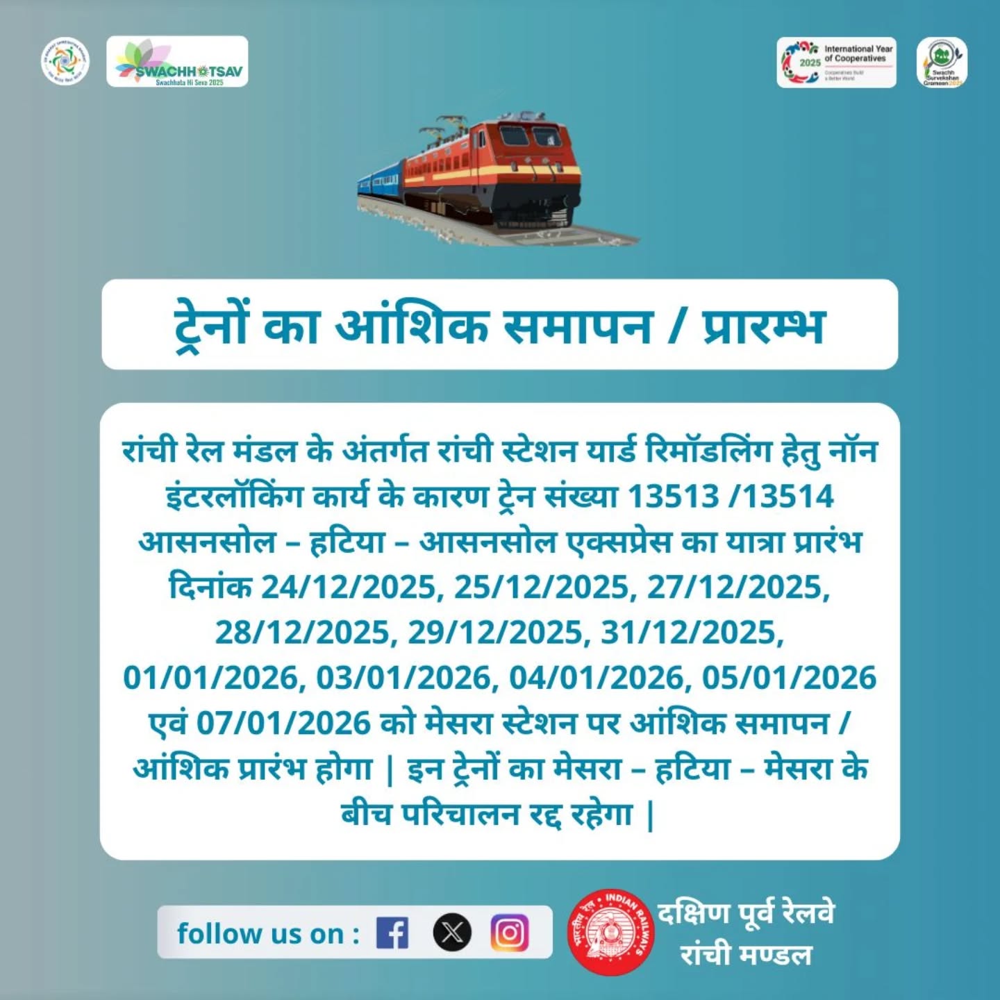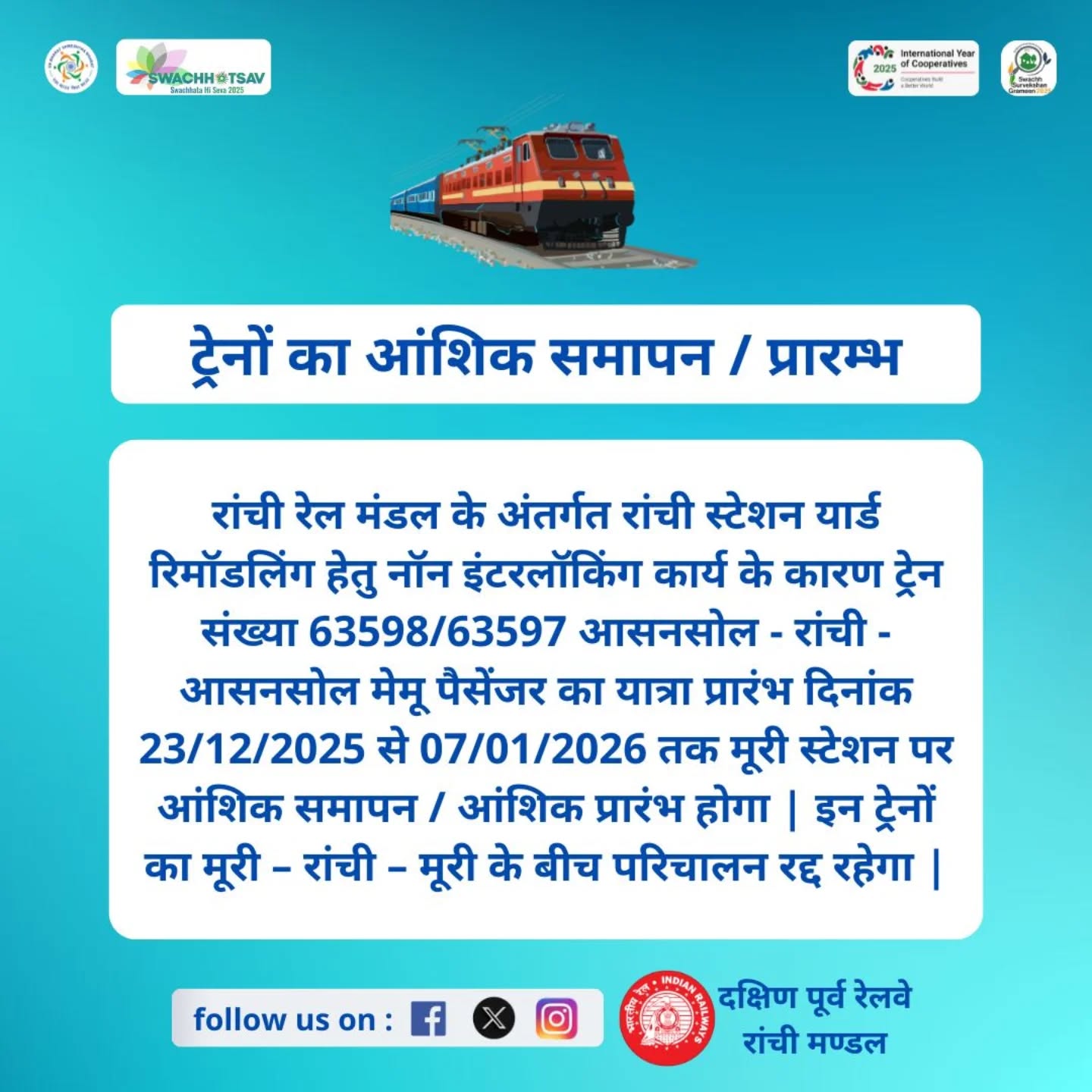 - कई एक्सप्रेस व मेमू ट्रेनों को पूर्णतः रद्द न करते हुए रेलवे ने उन्हें बीच के स्टेशनों से ही समाप्त या शुरू करने का निर्णय लिया है। Barddhaman–Hatia Express को बोकारो स्टील सिटी, Asansol–Ranchi MEMU और Kharagpur–Hatia Express को मुरी, जबकि Asansol–Hatia Express को मेसरा स्टेशन से शॉर्ट टर्मिनेट/शॉर्ट ओरिजन किया जाएगा।इसके अलावा Sasaram–Ranchi Express को पिस्का स्टेशन तक सीमित कर दिया गया है। रेलवे का कहना है कि यह व्यवस्था ट्रैक ब्लॉक और यार्ड कार्य के दौरान सुरक्षा उपायों को मजबूत बनाए रखने के लिए आवश्यक है।