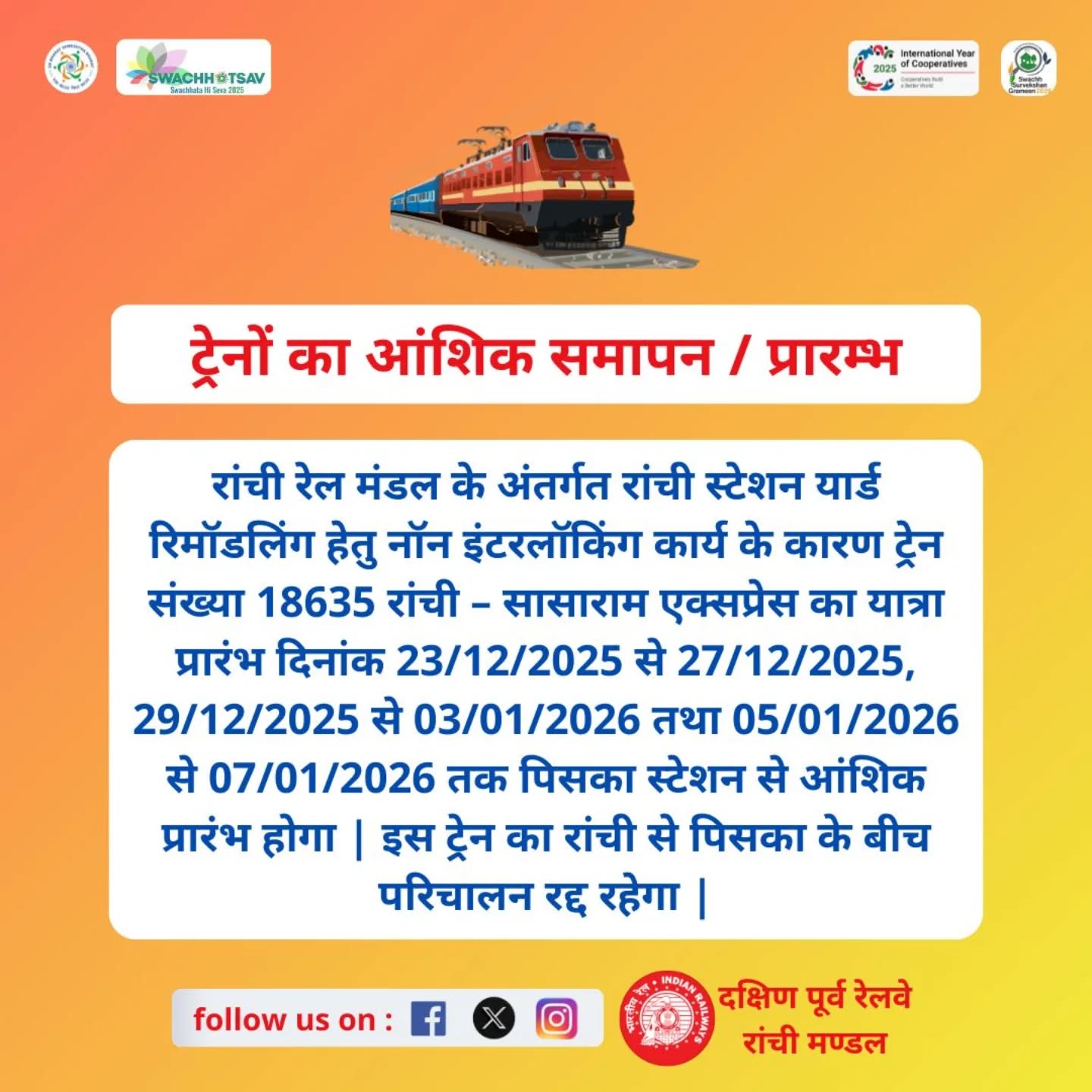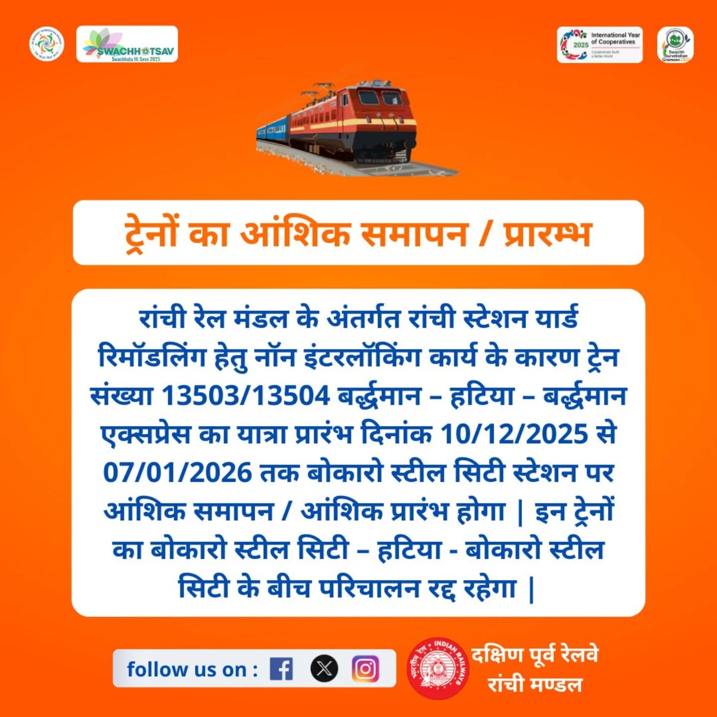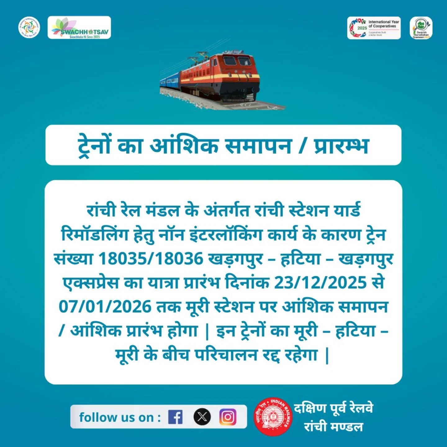 - कई एक्सप्रेस व मेमू ट्रेनों को पूर्णतः रद्द न करते हुए रेलवे ने उन्हें बीच के स्टेशनों से ही समाप्त या शुरू करने का निर्णय लिया है। Barddhaman–Hatia Express को बोकारो स्टील सिटी, Asansol–Ranchi MEMU और Kharagpur–Hatia Express को मुरी, जबकि Asansol–Hatia Express को मेसरा स्टेशन से शॉर्ट टर्मिनेट/शॉर्ट ओरिजन किया जाएगा।इसके अलावा Sasaram–Ranchi Express को पिस्का स्टेशन तक सीमित कर दिया गया है। रेलवे का कहना है कि यह व्यवस्था ट्रैक ब्लॉक और यार्ड कार्य के दौरान सुरक्षा उपायों को मजबूत बनाए रखने के लिए आवश्यक है।